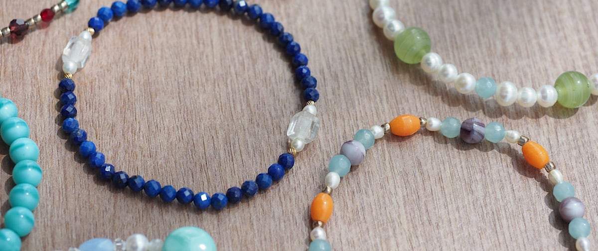内周 : 15 cm 素材 : ヴィンテージビーズ/クリスタルビーズ/淡水パール/ゴム ひと粒の8mmパシフィックブルー・ヴィンテージビーズとパイングリーンクリスタルが、深みと鮮やかさを手元に添えるブレスレット。 淡水パールが上品な艶を加え、ヴィンテージゴールドビーズが温かみをプラス。 さりげない華やかさで、どんなシーンにも自然に馴染むアクセサリーです。 ブレスレットは透明ゴムを使用しており、内周15cmになっています。 【コンディション】 ヴィンテージビーズには、小さな傷や汚れが見られる場合がございます。あらかじめご了承ください。 *撮影時には可能な限り実際の色味を再現するよう努めておりますが、完璧ではない場合がございますことをご了承ください。