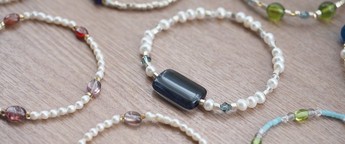 内周 : 15 cm 素材 : ヴィンテージビーズ/クリスタルビーズ/淡水パール/ゴム ひと粒の8mmパシフィックブルー・ヴィンテージビーズとパイングリーンクリスタルが、深みと鮮やかさを手元に添えるブレスレット。 淡水パールが上品な艶を加え、ヴィンテージゴールドビーズが温かみをプラス。 さりげない華やかさで、どんなシーンにも自然に馴染むアクセサリーです。 ブレスレットは透明ゴムを使用しており、内周15cmになっています。 【コンディション】 ヴィンテージビーズには、小さな傷や汚れが見られる場合がございます。あらかじめご了承ください。 *撮影時には可能な限り実際の色味を再現するよう努めておりますが、完璧ではない場合がございますことをご了承ください。