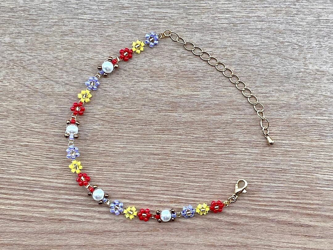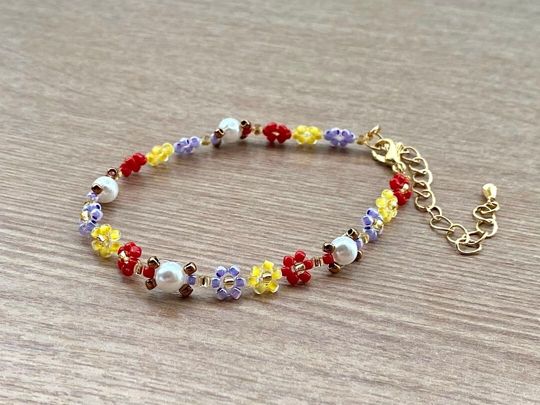 こちらは、クリムゾンレッド、イエロー、パープルの花が鮮やかに彩り、パールビーズを添えることで、上品な印象に仕上げています。