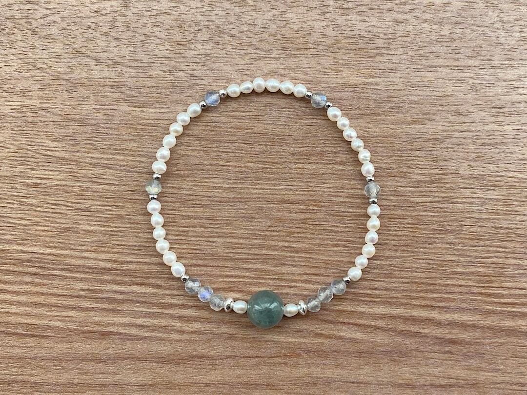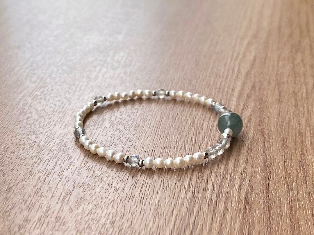7mmのグレイッシュアクアカラー・ブルートルマリンを使用したブレスレットです。ラブラドライトを添えることで、全体の色味に落ち着きと統一感を持たせました。