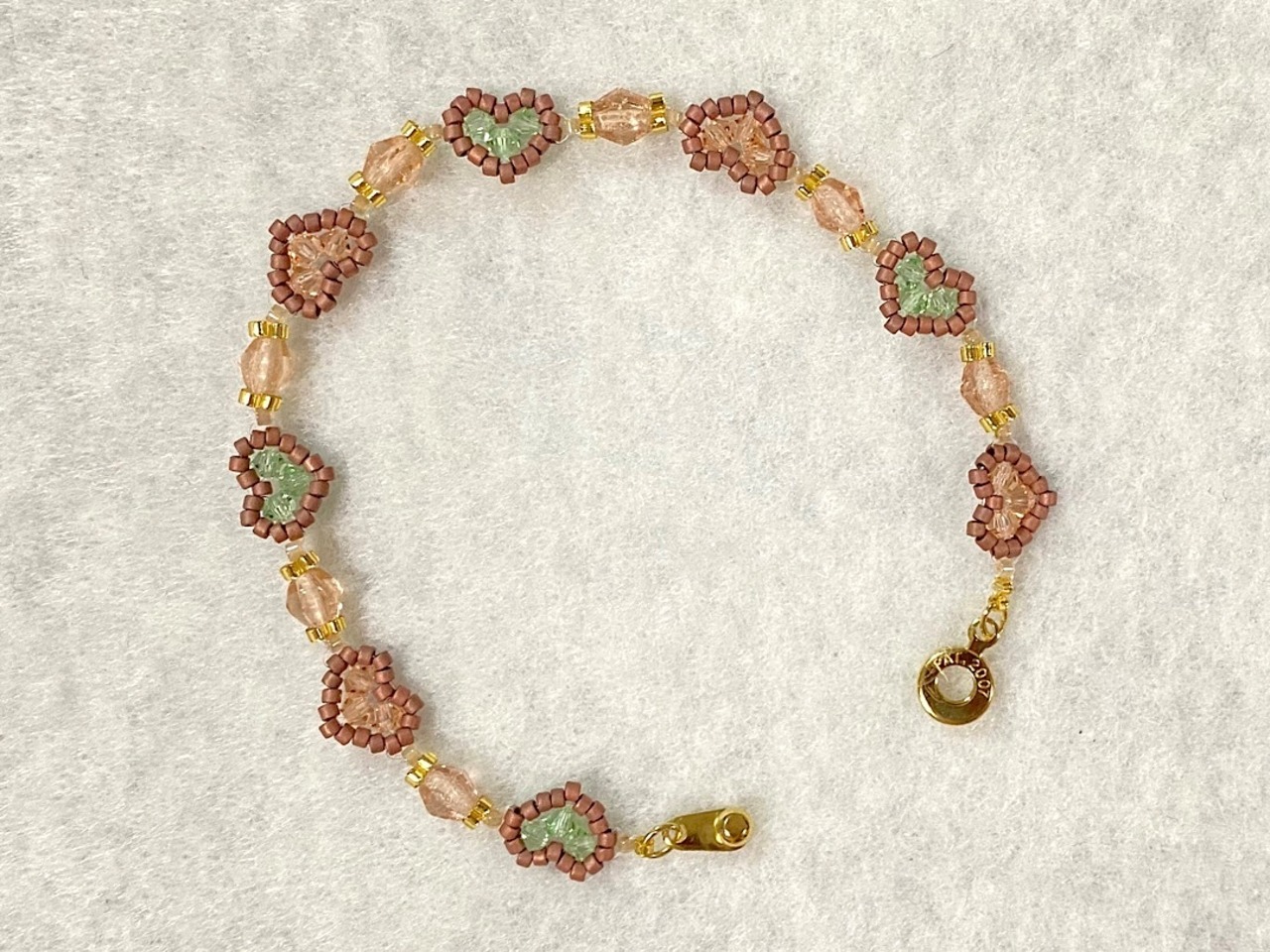 こちらは、エメラルドグリーンとピーチカラーのクリスタルビーズで作られた、可愛らしいハート型のブレスレットです。さらに、ピンキッシュベージュのヴィンテージビーズを加えることで、優しく上品な色合いに仕上げました。