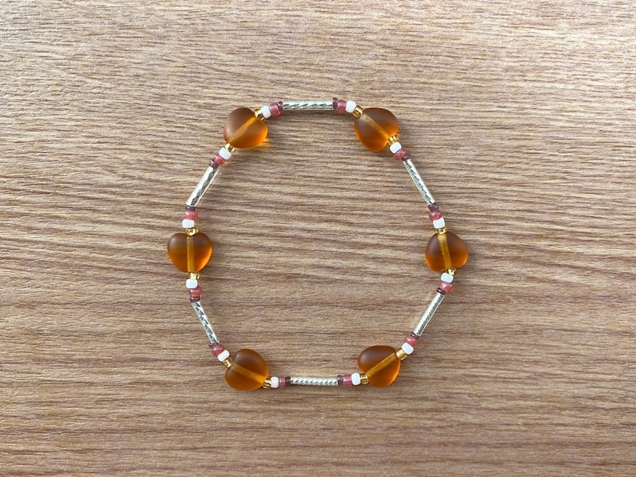 キャラメルカラーのハート型ヴィンテージビーズをメインに、ホワイトシルバービーズを組み合わせたブレスレット。