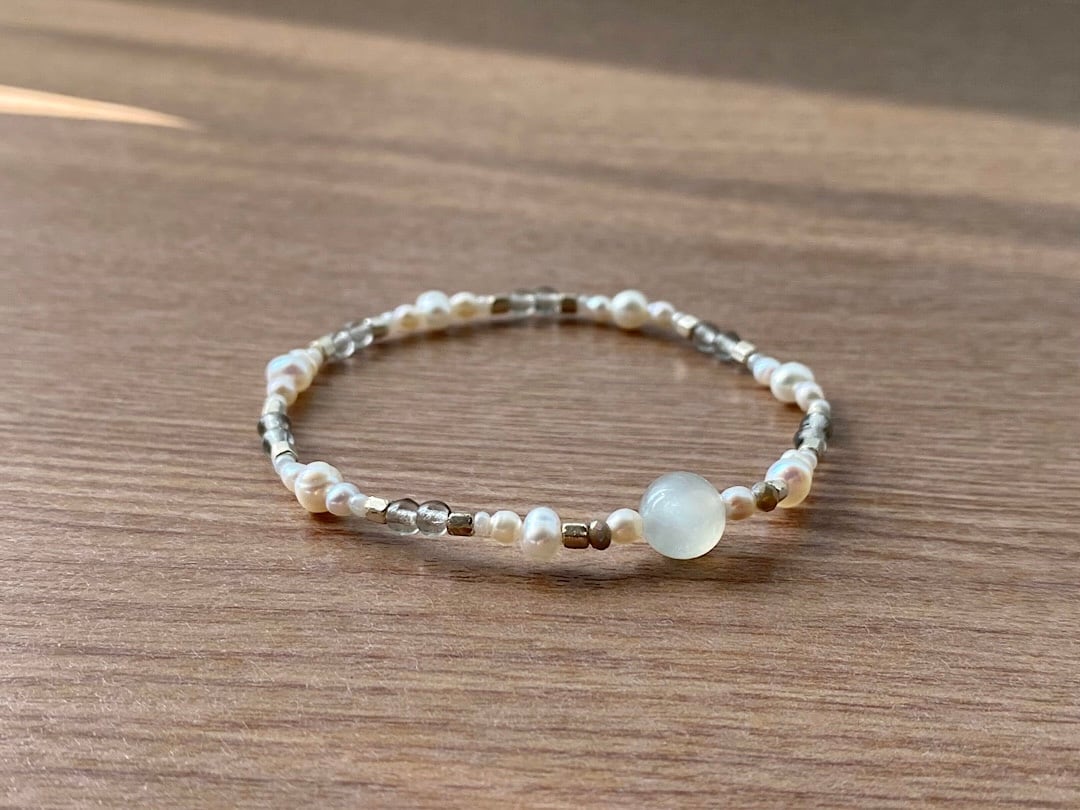 光にうっすらとシラーが浮かぶ7mmのグリーンムーンストーンを主役に、淡水パールを合わせたブレスレット。