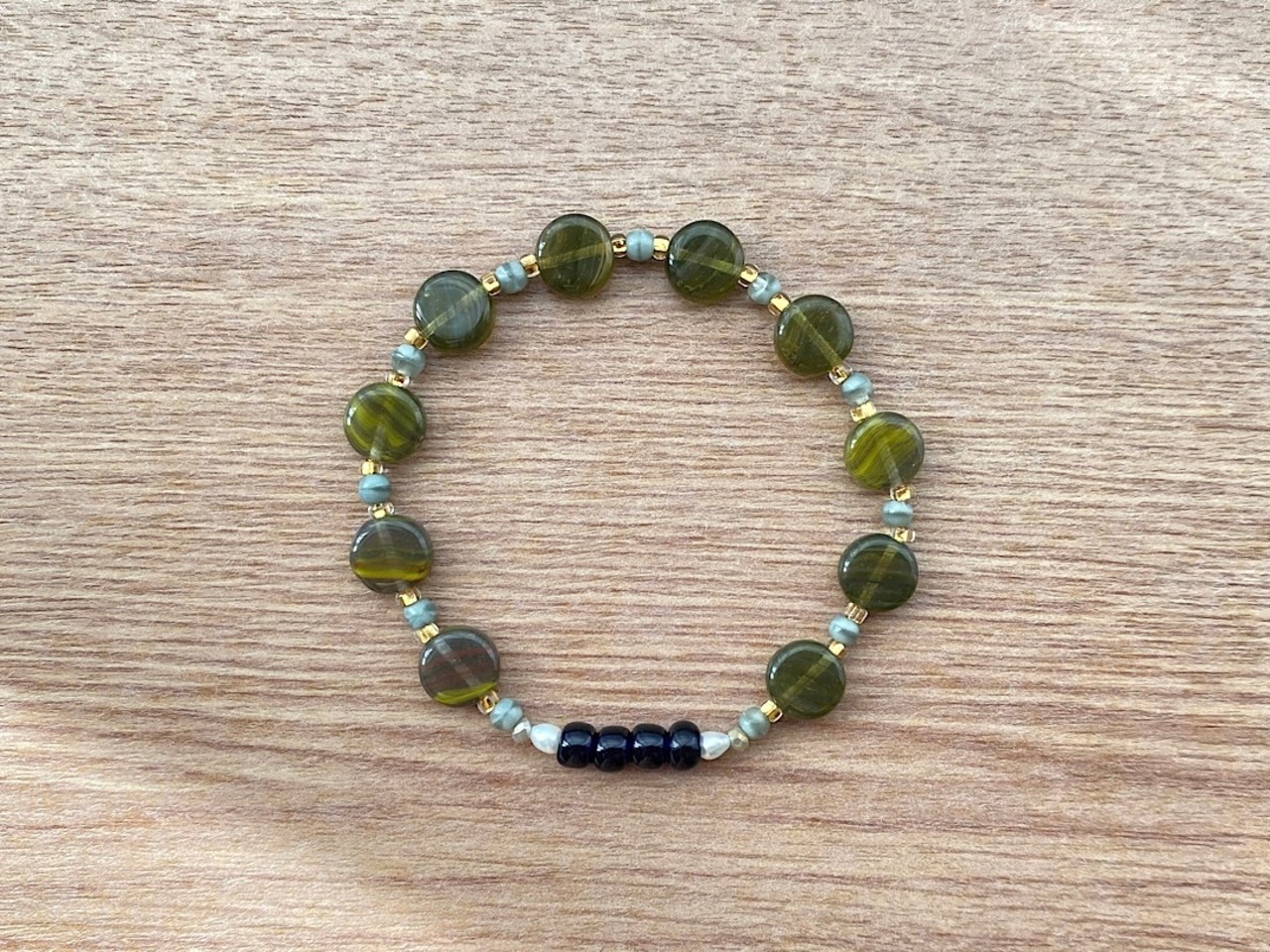夜を思わせるディープネイビーのヴィンテージビーズをアクセントに、温もりあるオリーブグリーンを組み合わせたブレスレット。