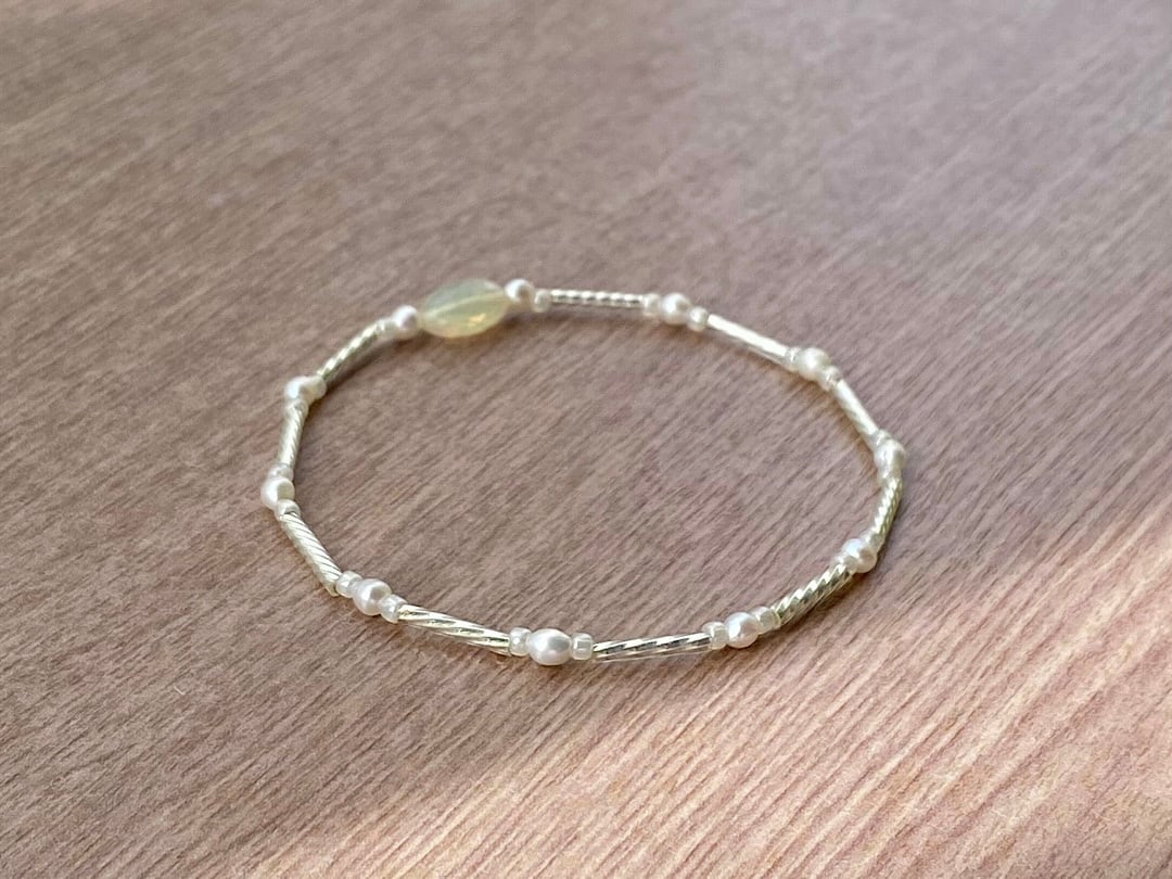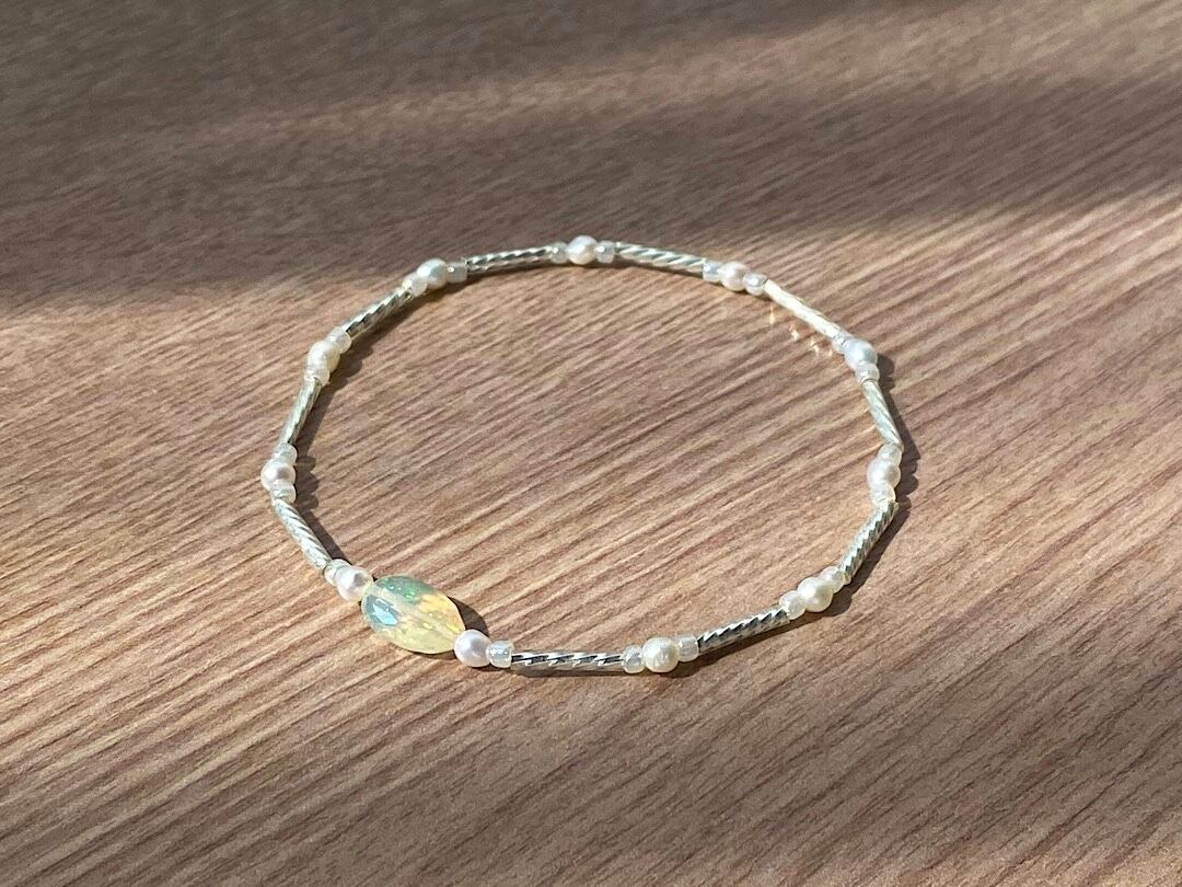 柔らかな光を纏うオパールを中心に、淡水パールとホワイトビーズを組み合わせたブレスレット。