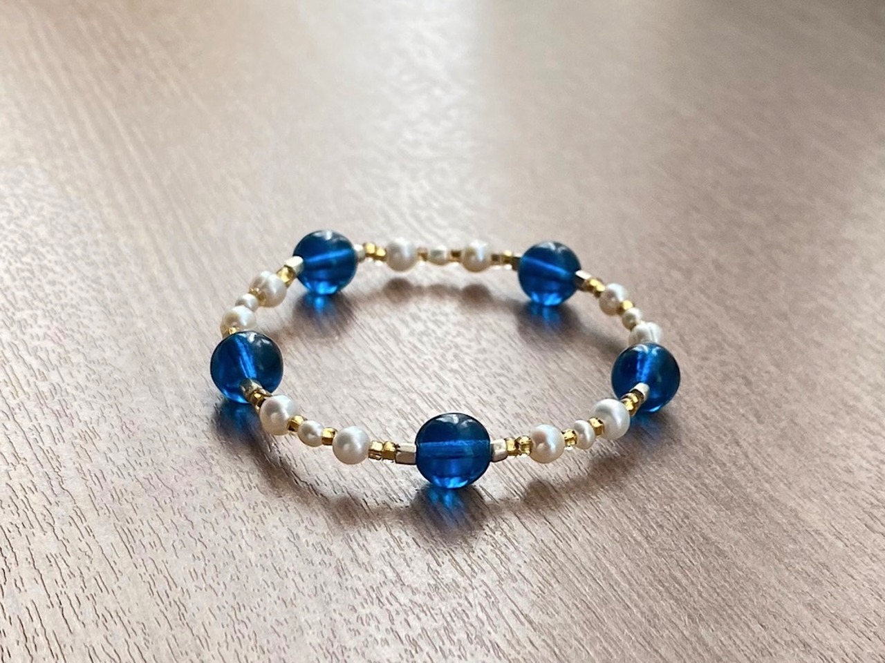 透明感のあるブルーと柔らかなパールのコントラストが、手元に上品で爽やかな印象を添えます。
