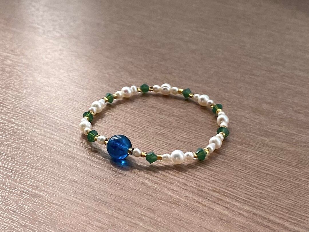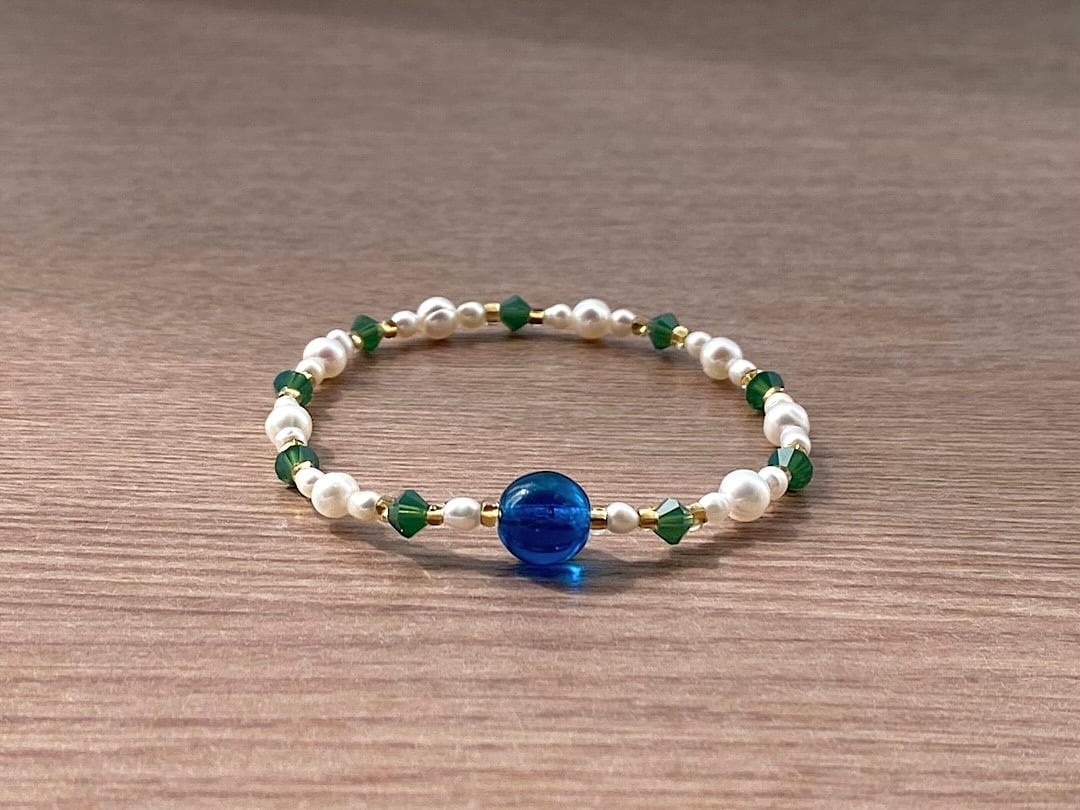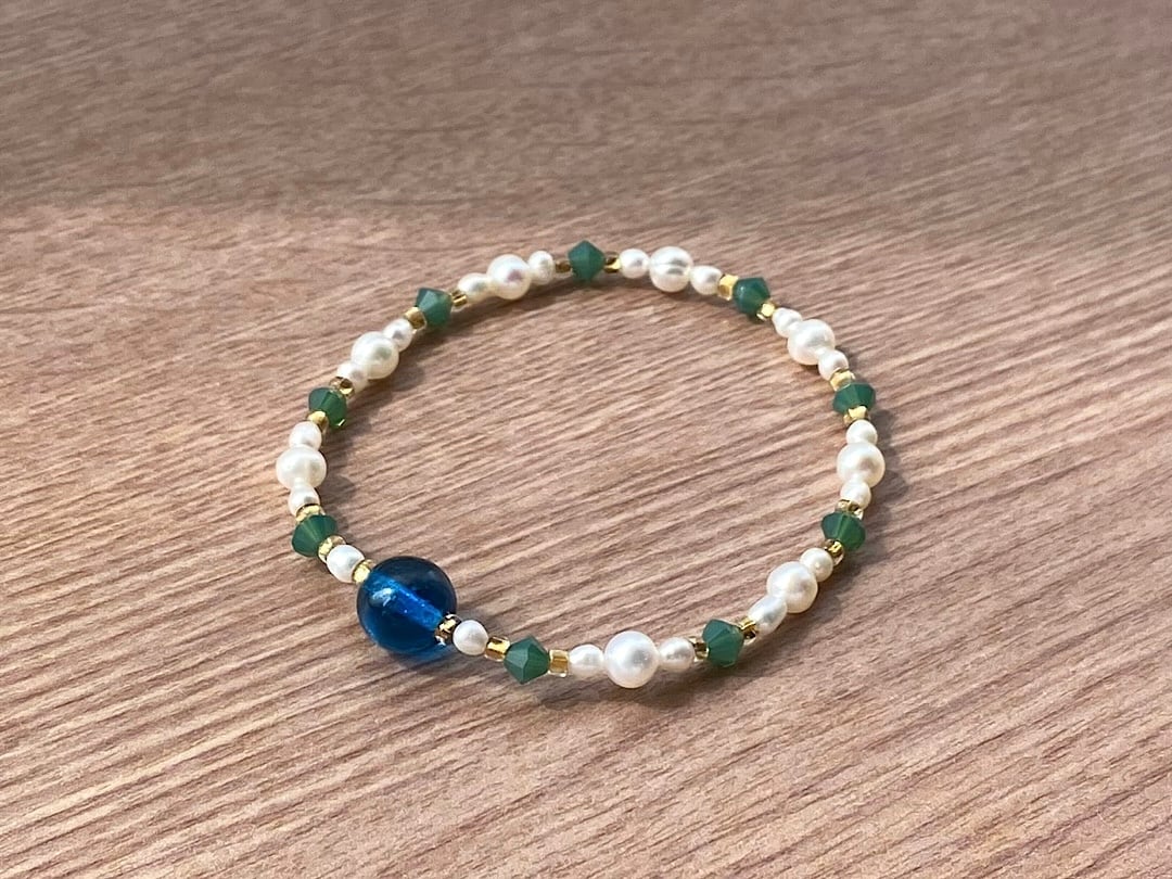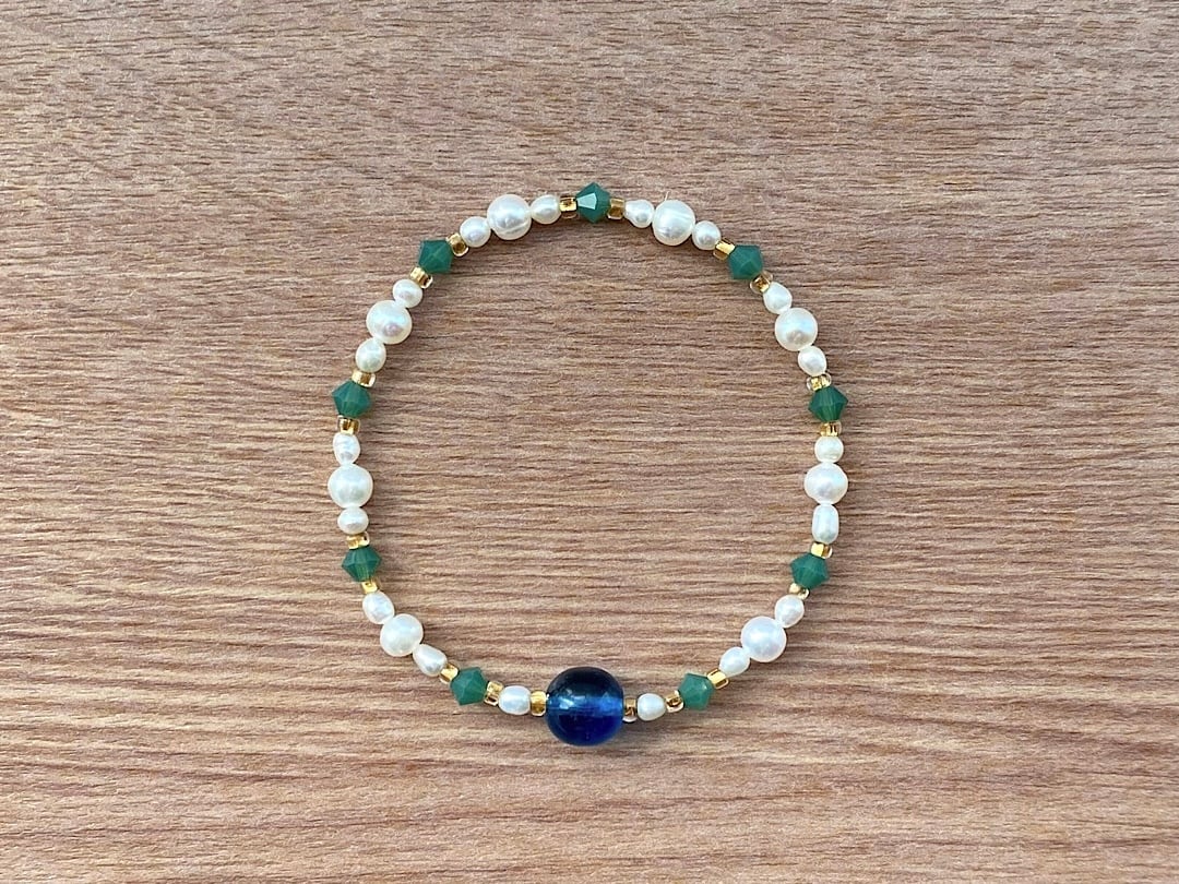 ひと粒の8mmパシフィックブルー・ヴィンテージビーズとパイングリーンクリスタルが、深みと鮮やかさを手元に添えるブレスレット。