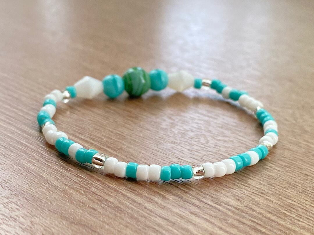 こちらは、8~5mmのグリーンとターコイズカラーのヴィンテージビーズを主役に、ホワイトビーズを組み合わせた、涼しげな雰囲気のブレスレットです。シルバービーズがアクセントとなり、全体の印象を引き締めています。