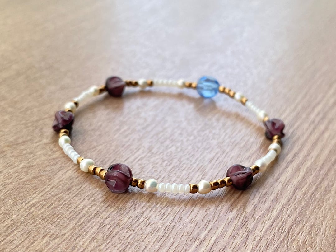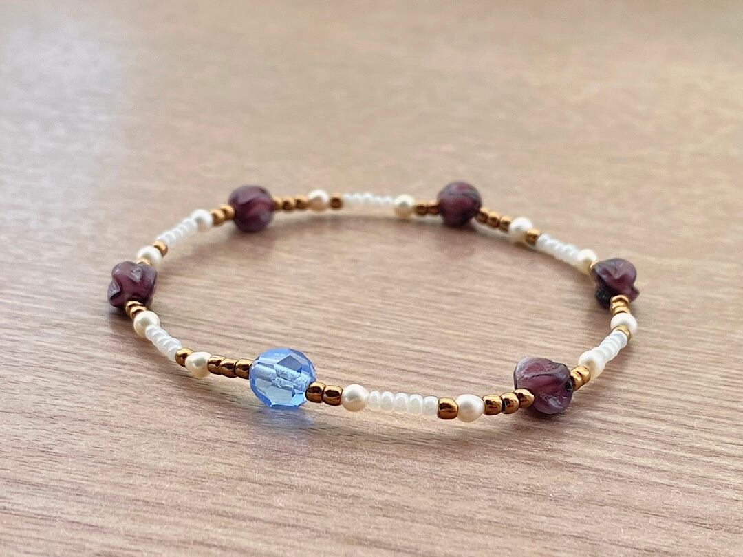 このブレスレットは、透き通るようなブルーのヴィンテージビーズを主役に、上品な印象に仕上げました。凹凸のあるパープルのヴィンテージビーズが、さりげなく個性を引き立てます。淡水パールが、手元にやわらかな華やかさを添えています。