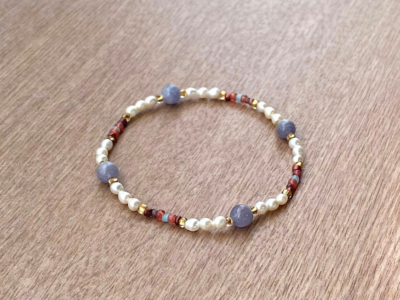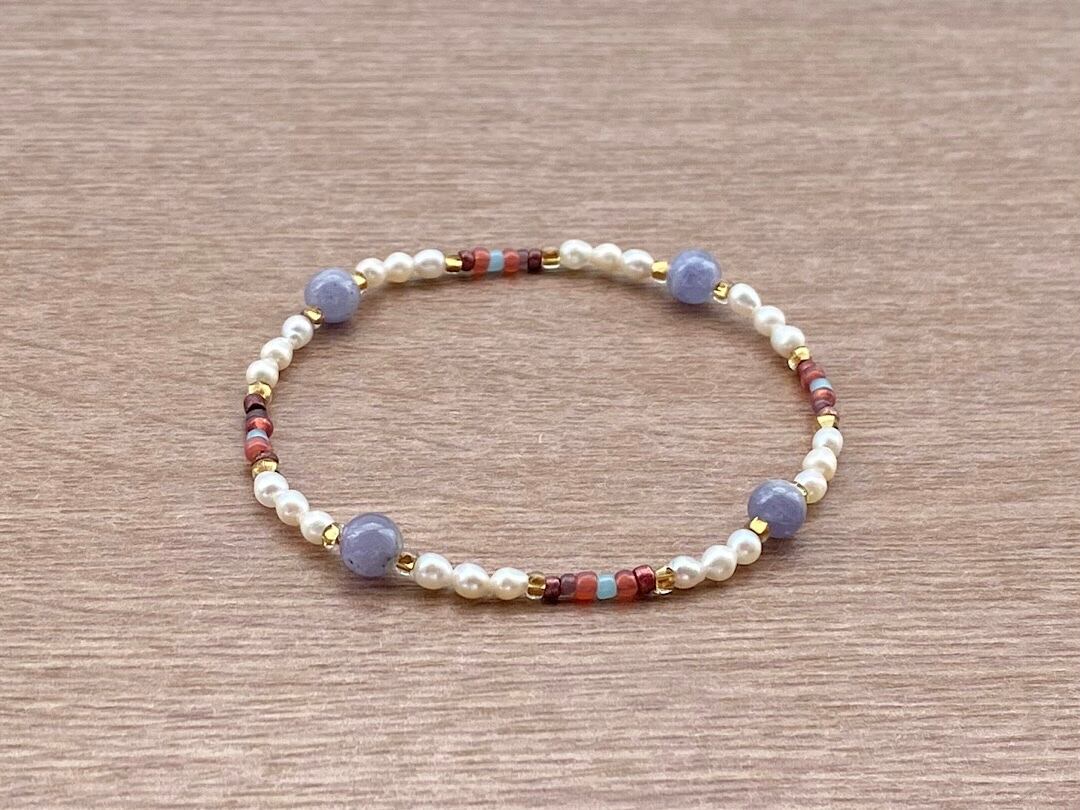淡水パールの柔らかな光沢と、ヴィンテージビーズの落ち着いた色合いが、手元に上品なアクセントを添えます。