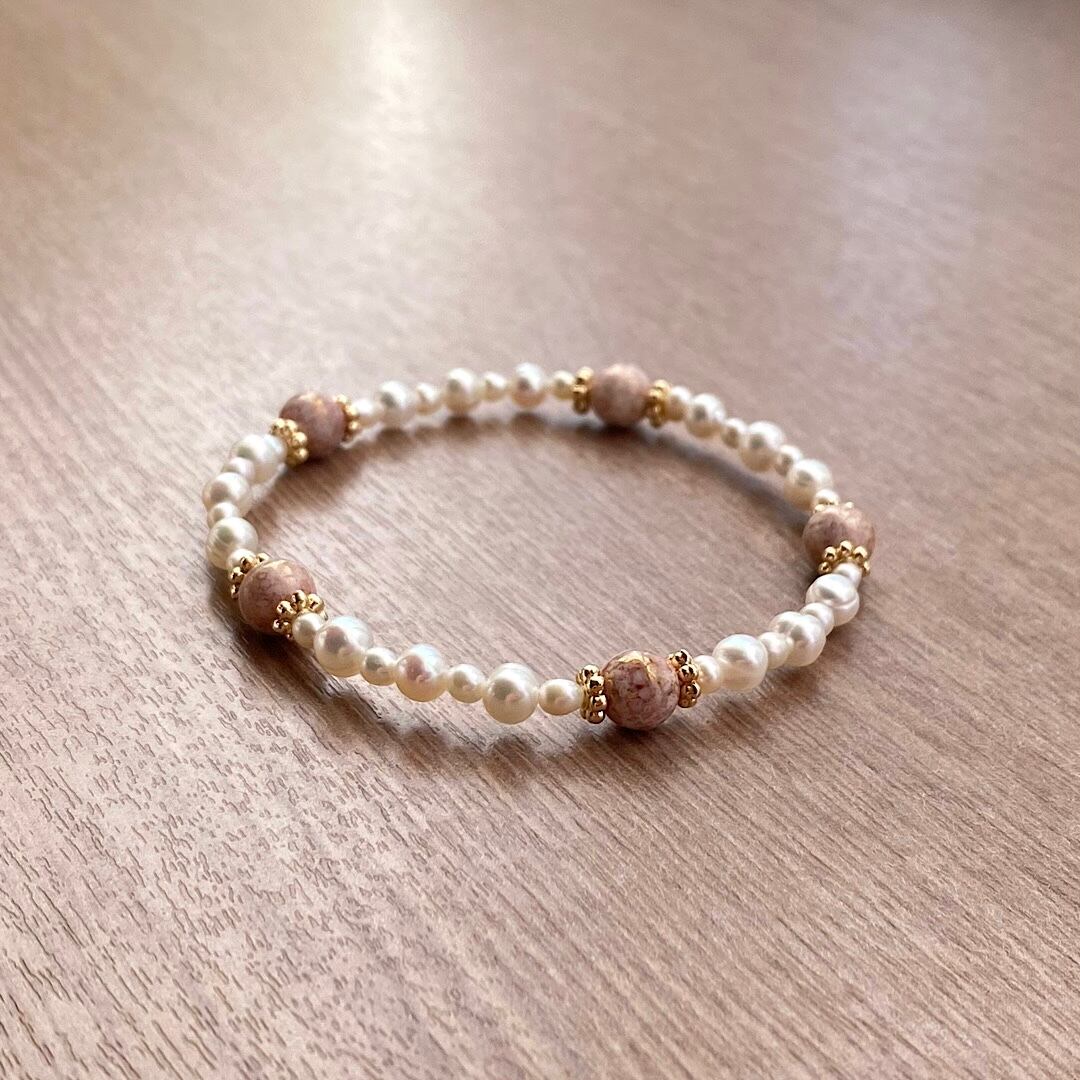 淡いピンクのヴィンテージビーズをアクセントに、艶やかな淡水パールを組み合わせたブレスレット。