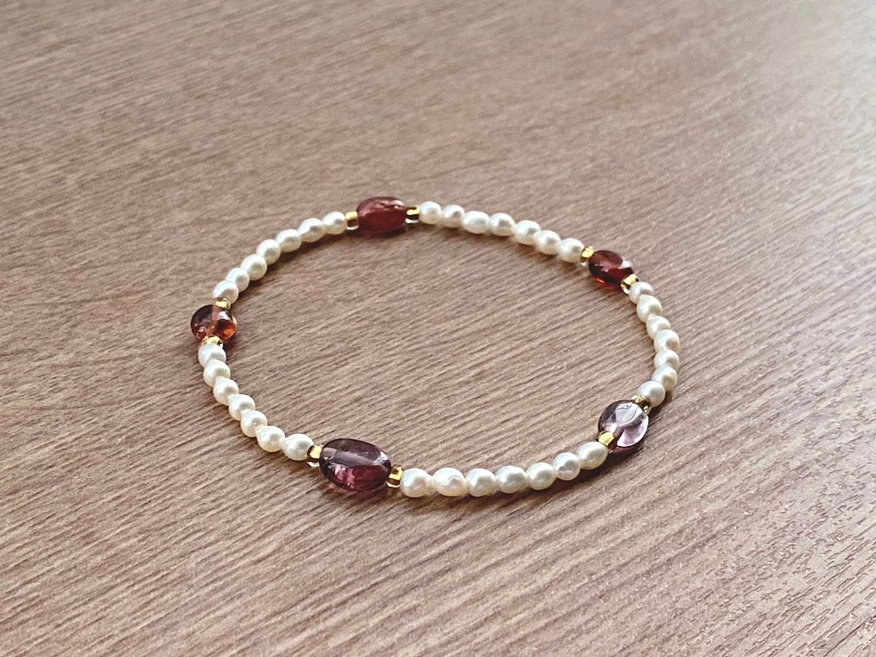 淡水パールに、赤紫の多彩な表情を見せるトルマリンを組み合わせたブレスレットです。