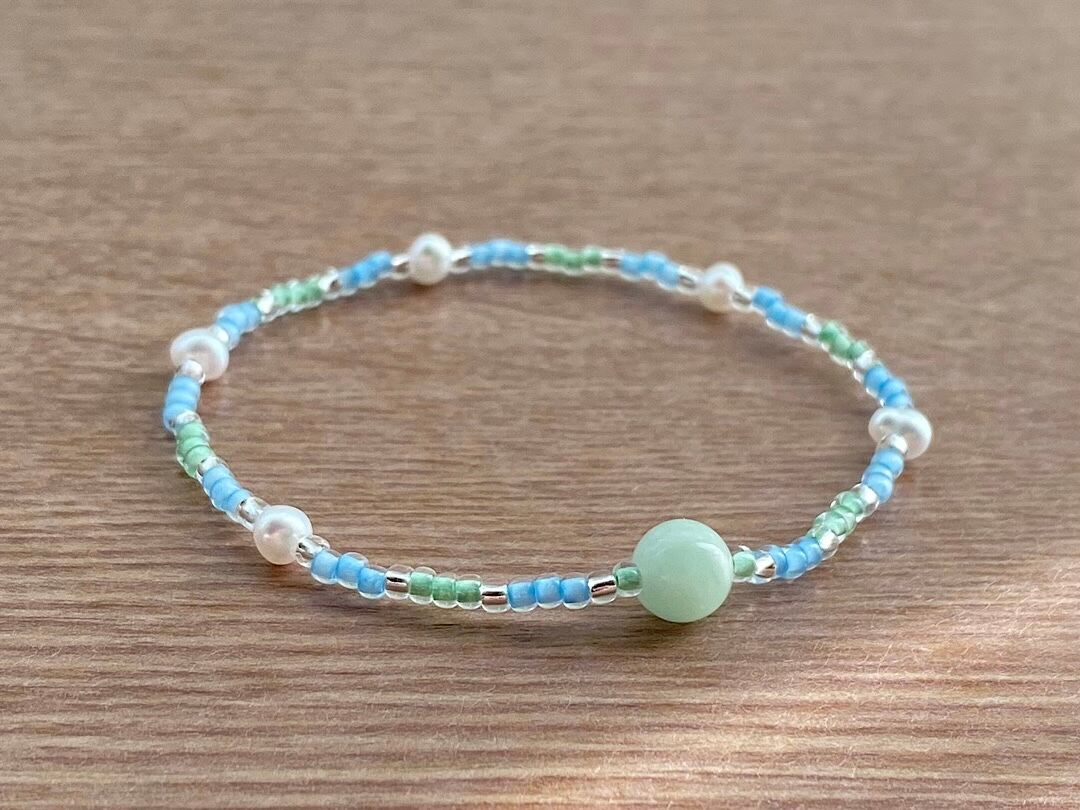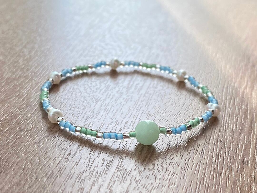 こちらは、6mmのグリーンムーンストーンを主役に、スカイブルーとライトグリーンのビーズを組み合わせた、清涼感のあるブレスレットです。淡水パールが手元にさりげない上品さを添えてくれます。