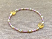 こちらは、ライトアンバーのハート型ヴィンテージビーズを主役に、淡いラベンダーカラーのビーズと小さな淡水パールを組み合わせた、上品で女性らしいブレスレットです。アクセントにゴールドビーズをあしらい、やわらかな華やかさを加えました。
