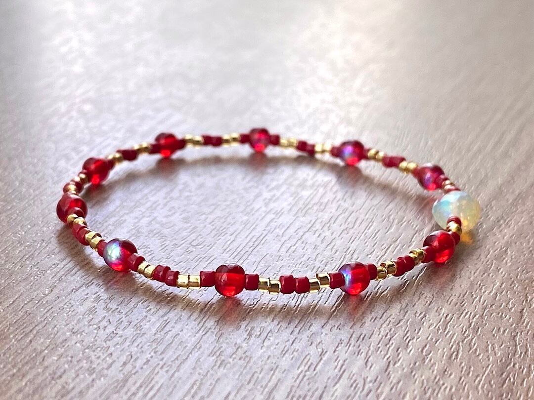 こちらは、9mmの一粒オパールを主役に、光沢のあるレッドヴィンテージビーズを組み合わせた、明るく鮮やかなカラーと幻想的な輝きが魅力のブレスレットです。ゴールドのビーズが、全体に華やかさを添えています。