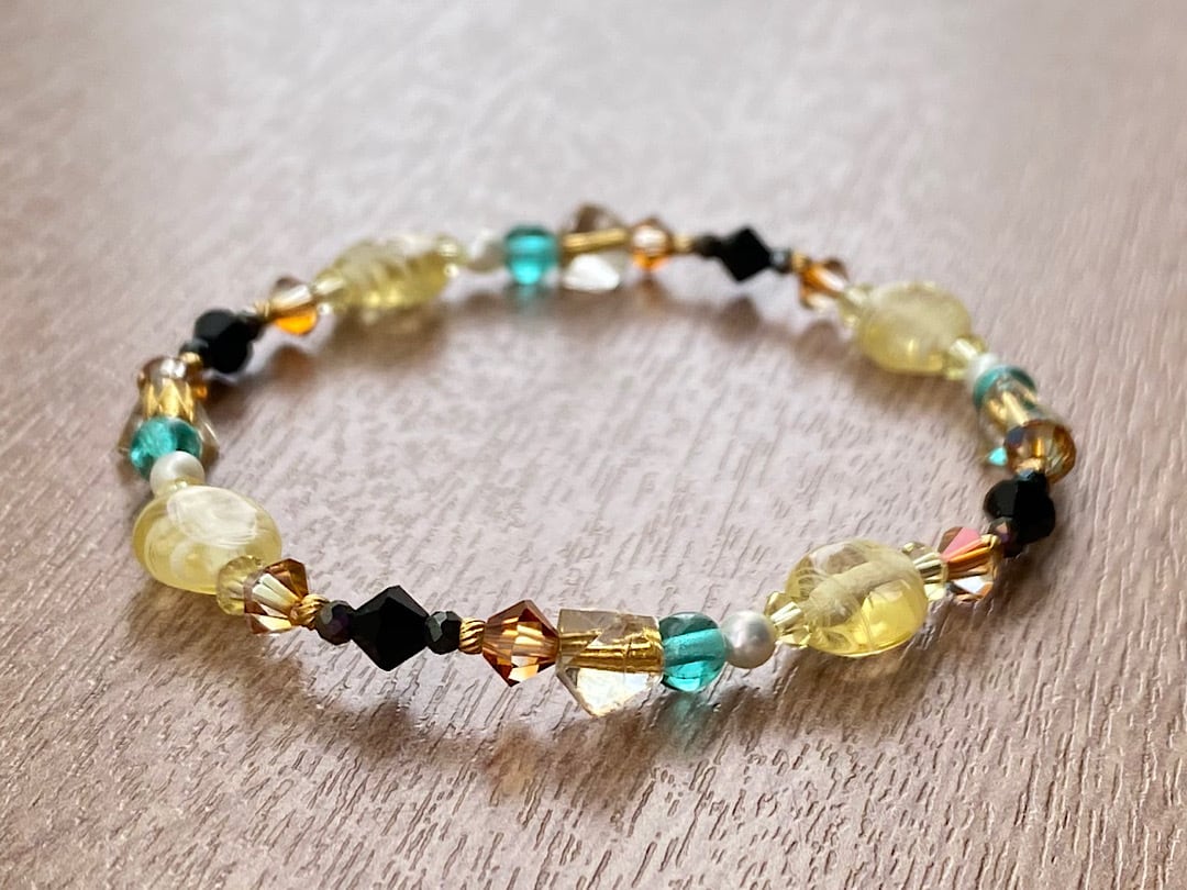 こちらは、柔らかなライトイエローやアンバーを基調に、ブラックとティールをアクセントとして効かせた、落ち着きのある配色のブレスレットです。クリスタルビーズのきらめきと淡水パールの上品な質感が、全体に洗練された印象を添えています。さらに、コーティングが施された2mmのブラックスピネルが全体を程よく引き締めています。