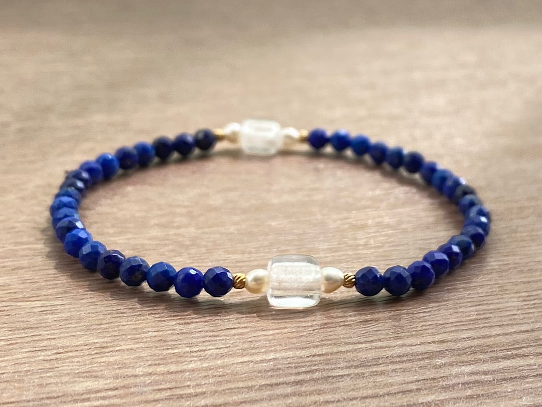 こちらは、3mmのラピスラズリとフロストキューブヴィンテージビーズを組み合わせたシンプルなブレスレットです。小さな淡水パールとゴールドカラーのヴィンテージビーズが、手元にさりげない上品さを添えてくれます。