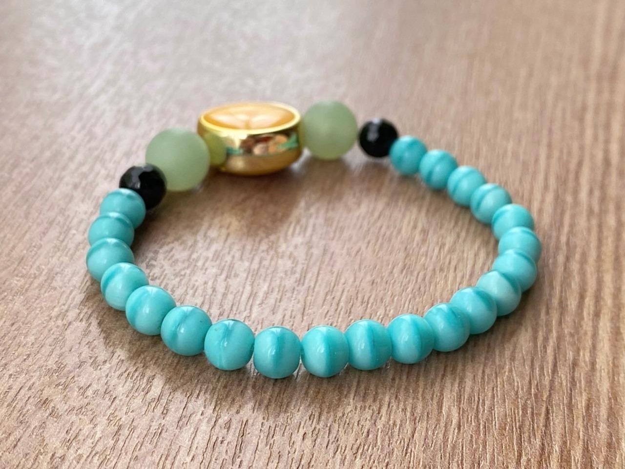 こちらは、15mmのハニーイエローカラーが愛らしい丸型ビーズを主役に、ユーカリプタスグリーンのヴィンテージビーズと6mmのオニキスを組み合わせた、個性的で洗練された配色のブレスレットです。周囲を彩るターコイズカラーのヴィンテージビーズが、全体に明るく爽やかな印象を添えています。