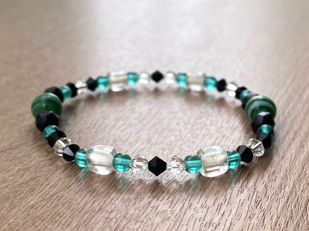 こちらは、7mmのグリーンマーブル模様のヴィンテージビーズを主役に、ブラックとクリスタルビーズ、そしてティールカラーのヴィンテージビーズを組み合わせた、ハンサムで透明感のあるブレスレットです。さらに、フロストキューブビーズをアクセントに加えることで、爽やかさも引き立てました。