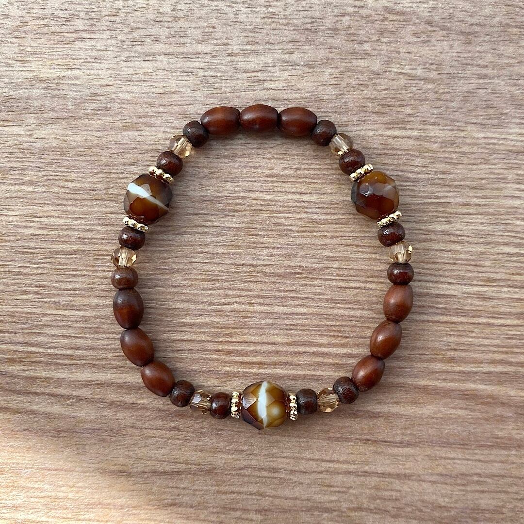 ブラウンとホワイトのマーブル模様が美しいヴィンテージビーズを主役に、ウッドビーズとクリスタルビーズを組み合わせたブレスレットです。