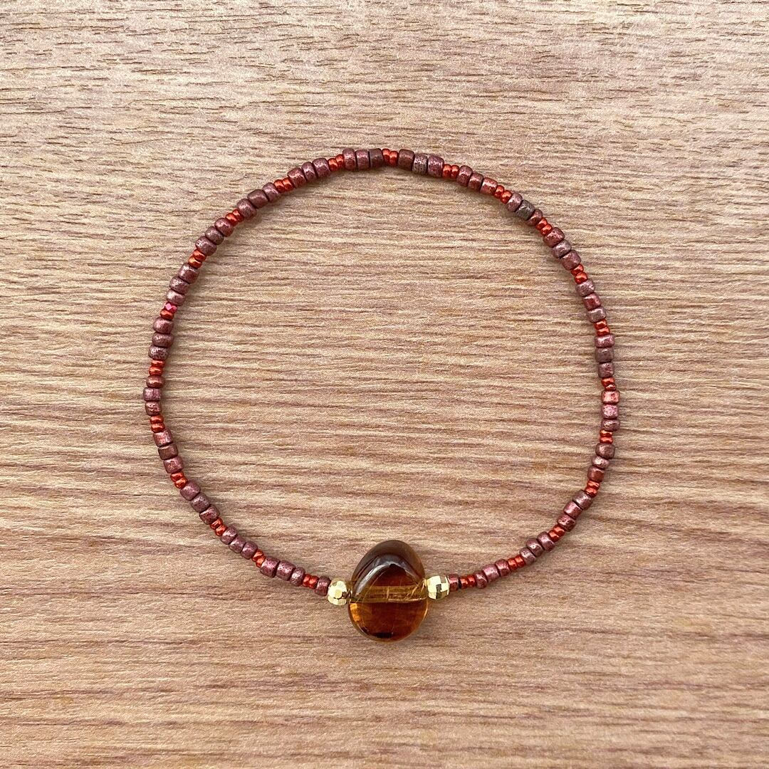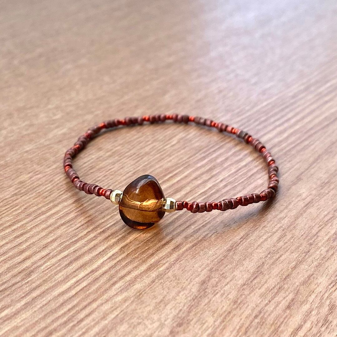 中央にはスモーキーアンバーのヴィンテージビーズを合わせ、落ち着いた色合いの中に上品な透明感を添えました。