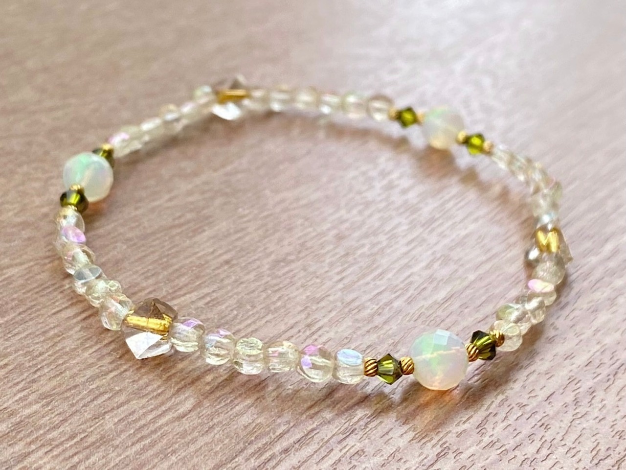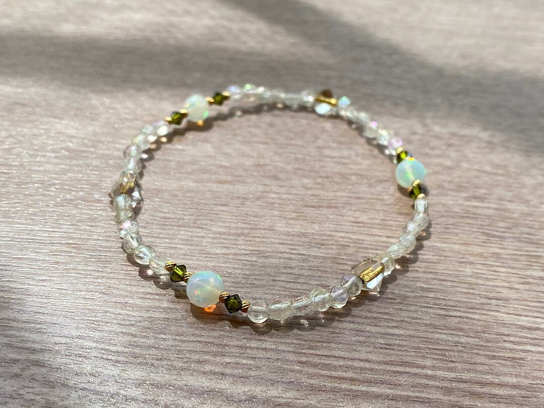 こちらのブレスレットは、4~5mmのオパールを主役に、カーキグリーンのクリスタルビーズと、虹色のやわらかな輝きを放つヴィンテージビーズを組み合わせました。静かな光をまとったビーズたちが、手元に優しいきらめきを添えます。アクセントには三角形のヴィンテージビーズを用い、内側のゴールドが全体をすっきりと引き締めています。