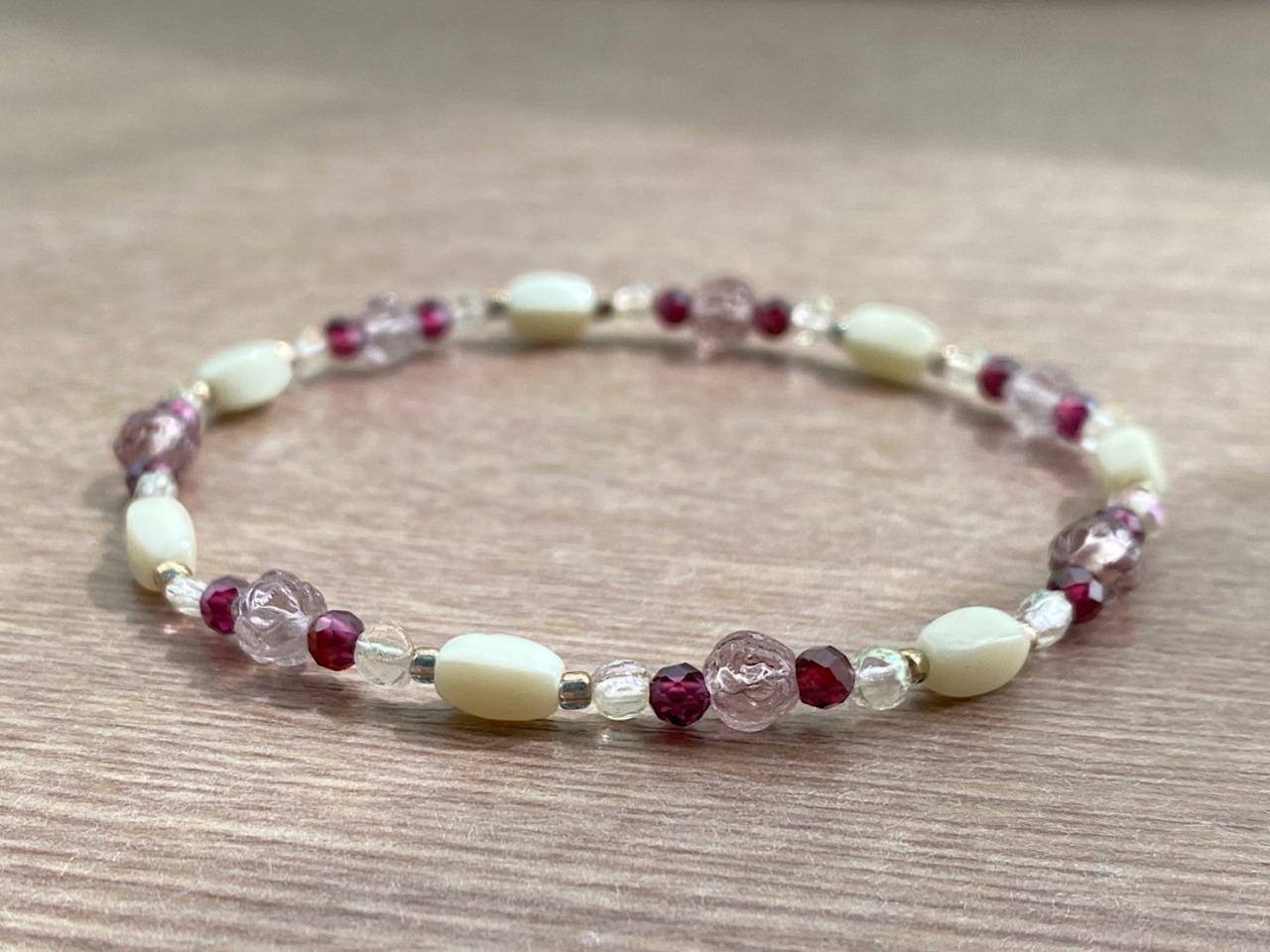 こちらのブレスレットは、薔薇の蕾を思わせるモーヴのヴィンテージビーズを主役に、3mmのガーネットと、オーロラのようにやさしく光を放つヴインテージビーズを組み合わせました。落ち着いた色合いと繊細な光のニュアンスが、穏やかで心地よい印象をもたらします。さらに、アイボリーカラーのヴィンテージビーズをアクセントに加えることで、全体を上品で洗練された印象に仕上げています。