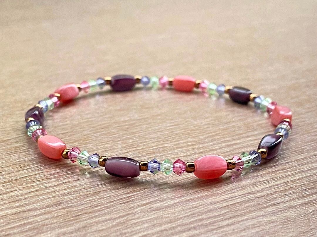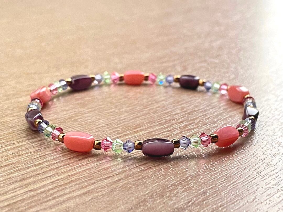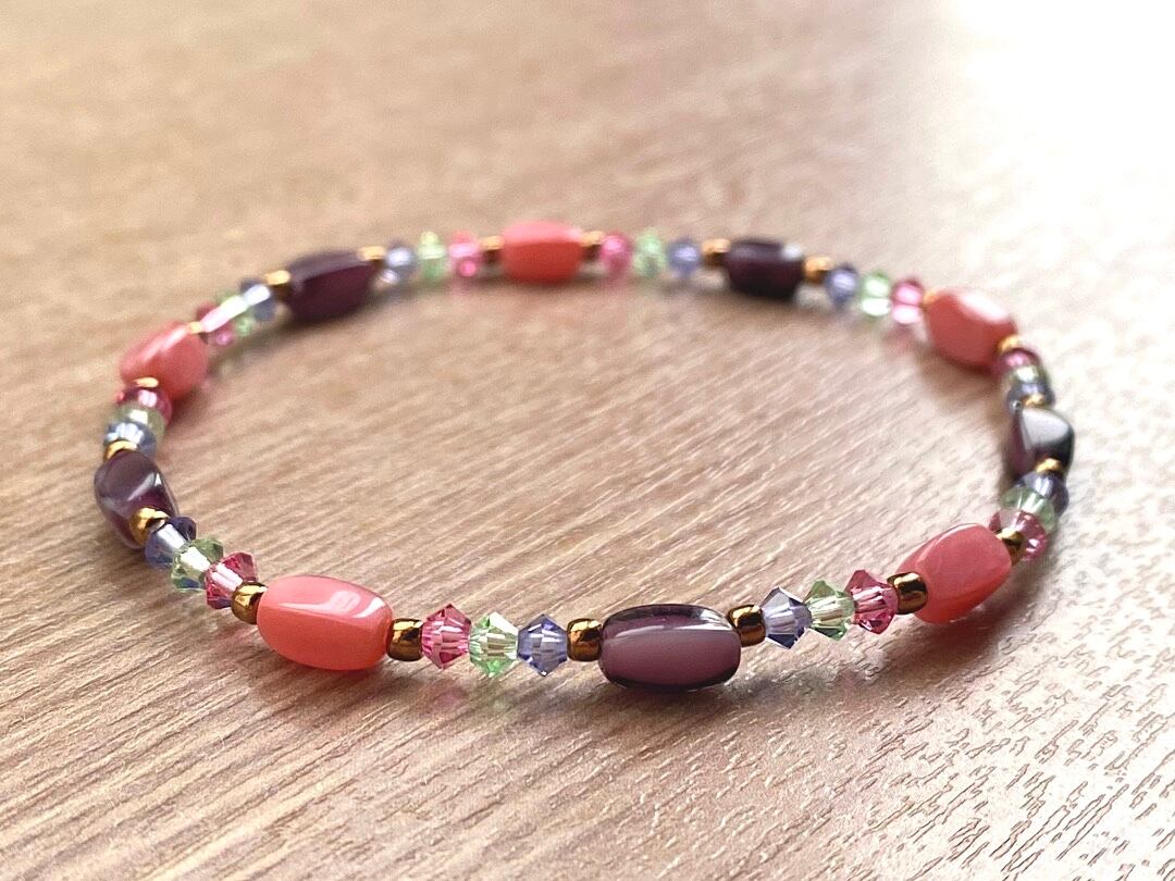 こちらは、ローズとパープルのヴィンテージビーズが落ち着いた色合いで調和し、クリスタルビーズの繊細な輝きがアクセントを添える、可愛らしさと上品な雰囲気をあわせ持つブレスレットです。