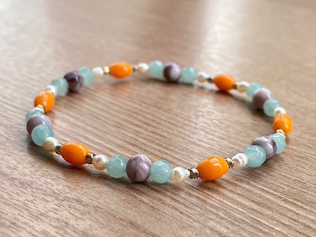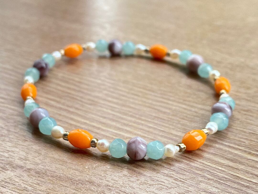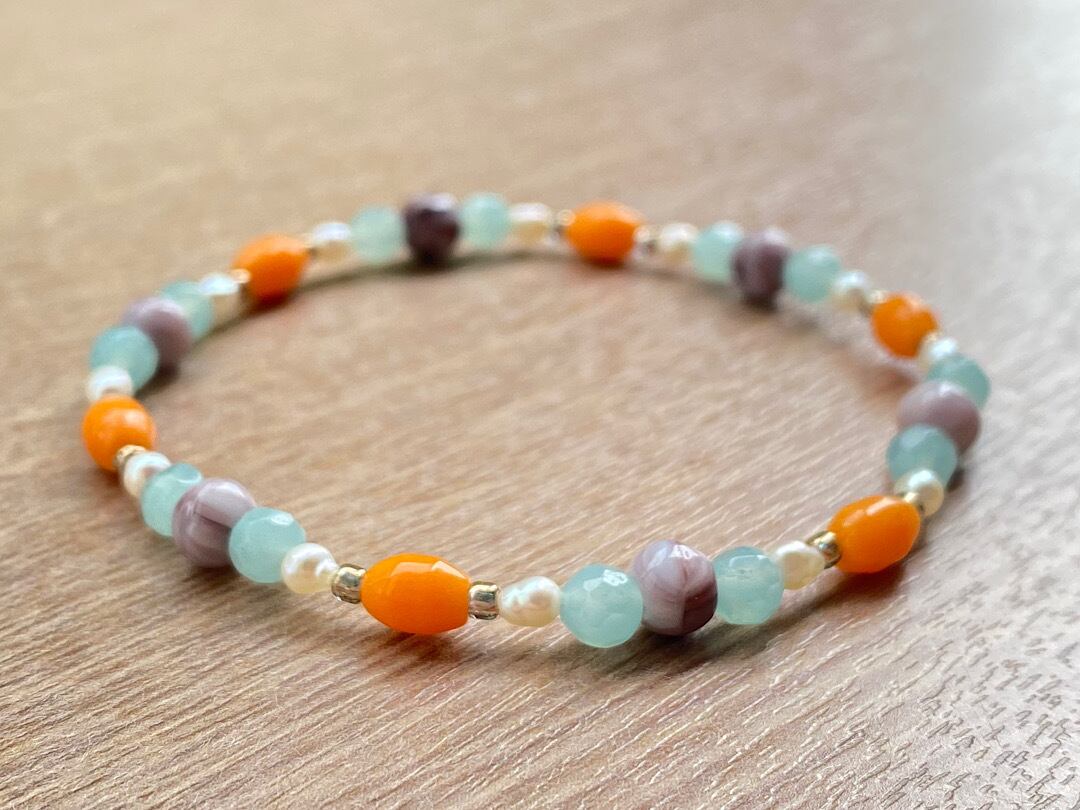 オレンジのヴィンテージビーズをアクセントに加え、明るさをプラスしました。さらに淡水パールを添えて、柔らかな雰囲気と落ち着いた印象が調和した、シンプルで上品なデザインに仕上げています。