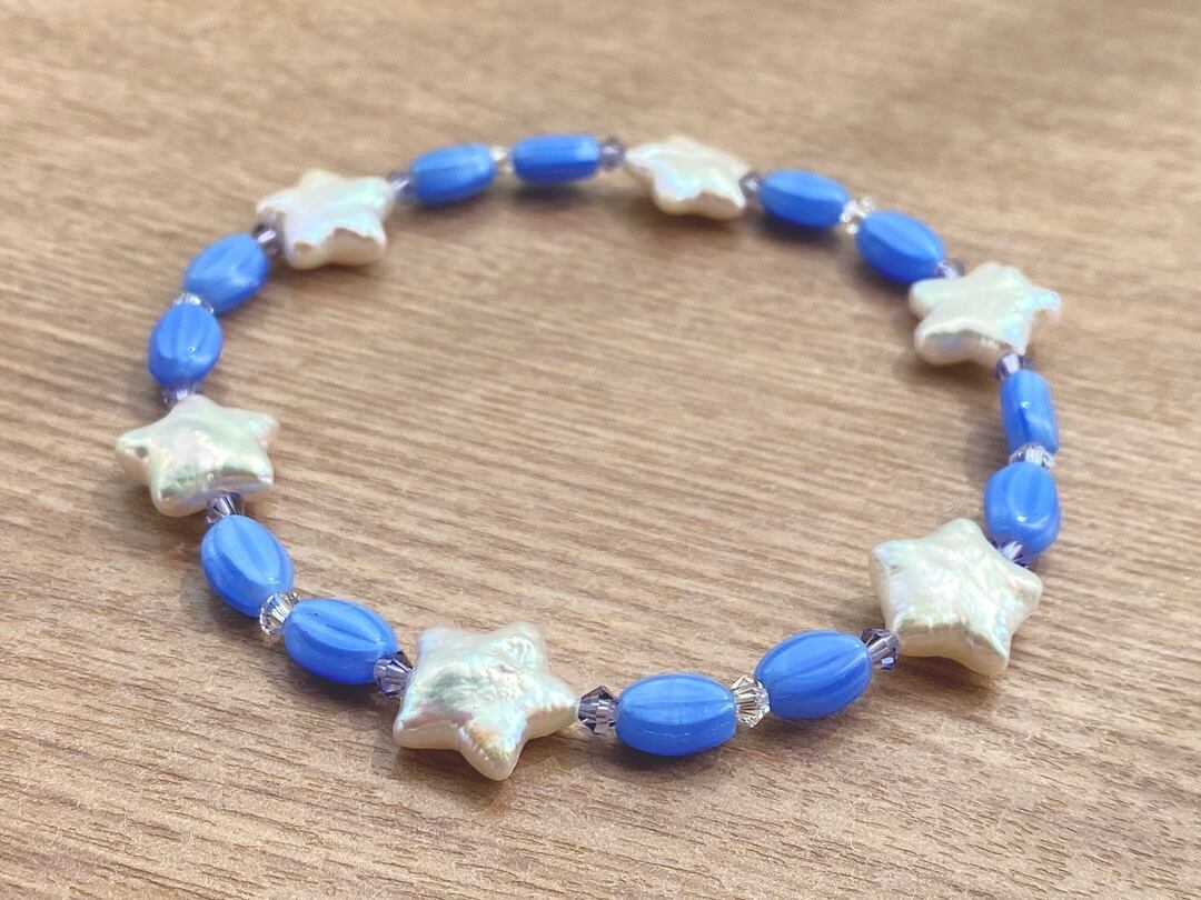 こちらは、星形の淡水パールを主役に、ブルーカラ一のヴィンテージビーズとクリスタルビーズを組み合わせたブレスレットです。爽やかな色合いと上品な輝きが手元を美しく引き立てます。