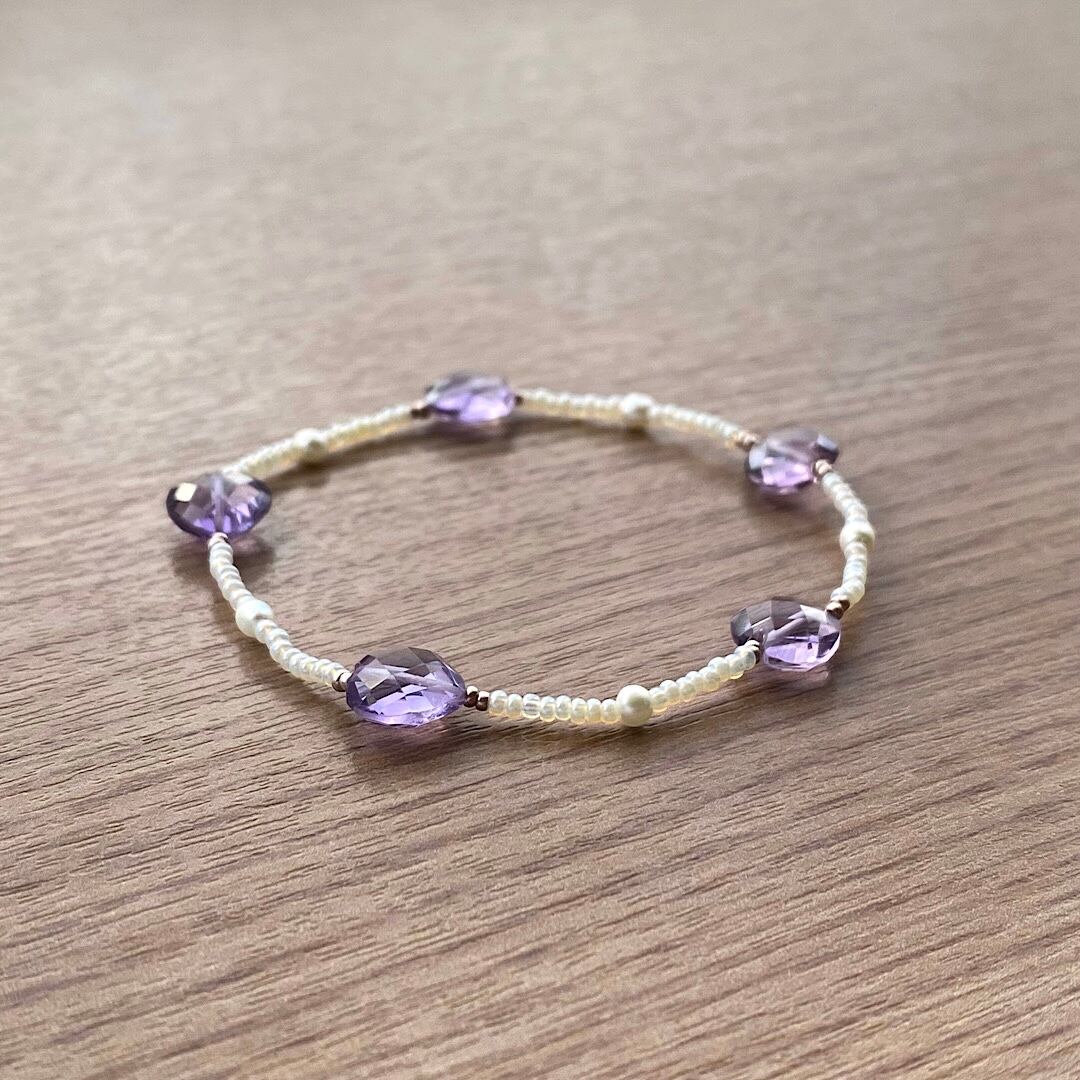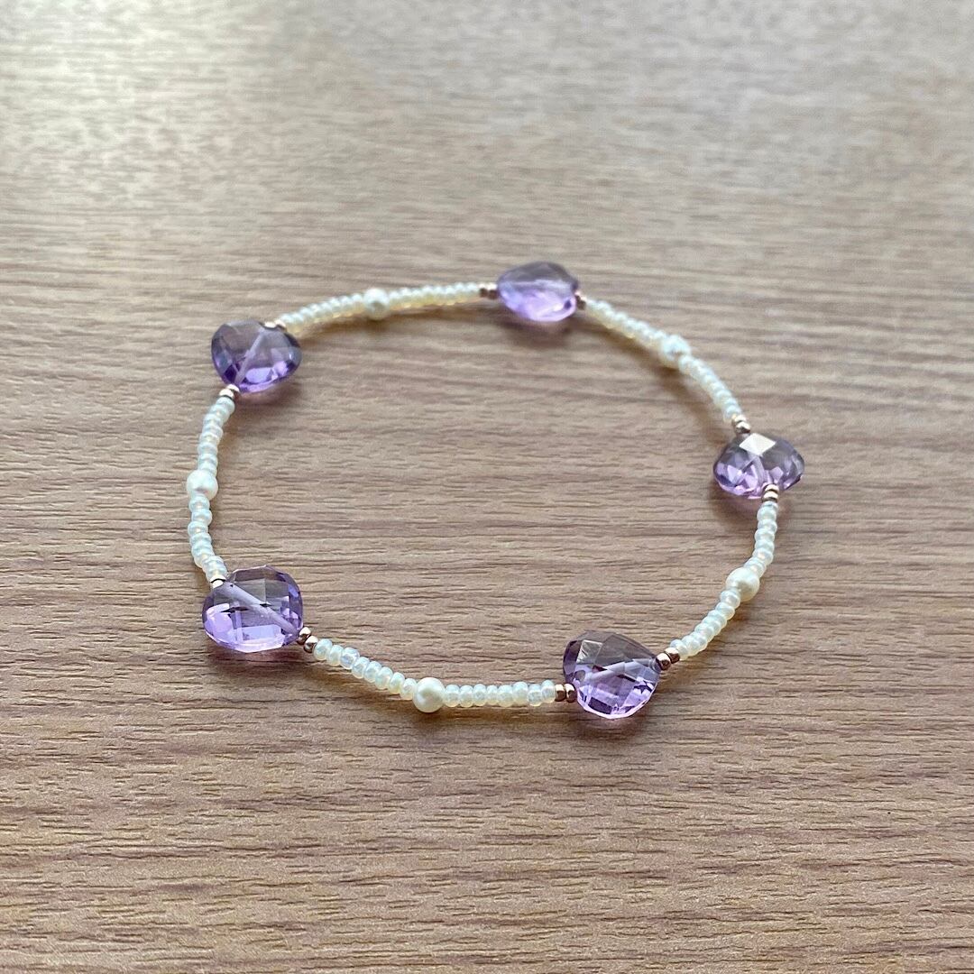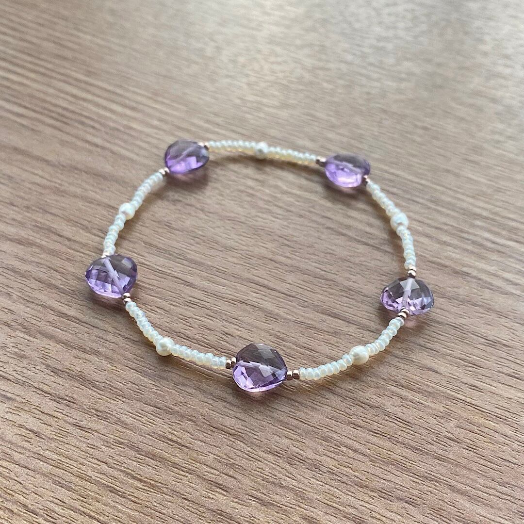 淡い紫色のハート型アメジストを主役にした、繊細なブレスレットです。