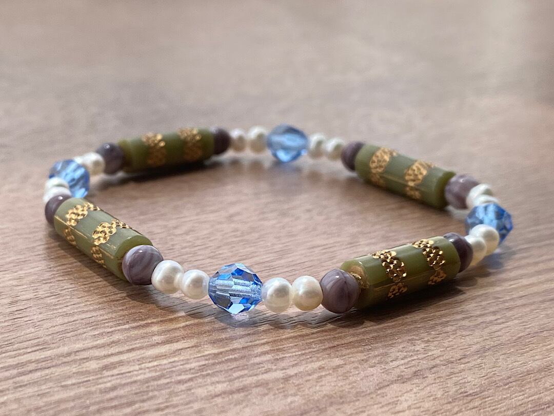 こちらのブレスレットは、ゴールド模様があしらわれたオリーブグリーンのヴィンテージビーズが印象的なデザインです。アクセントとして加えたブルーのヴィンテージビーズが、落ち着いた色合いに爽やかさを添え、淡水パールが全体を上品にまとめています。