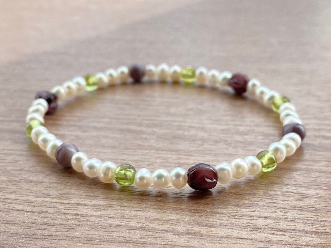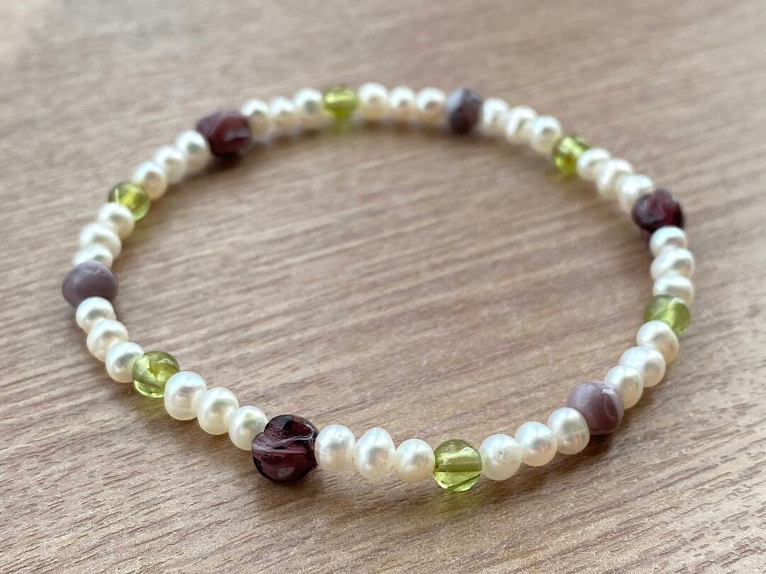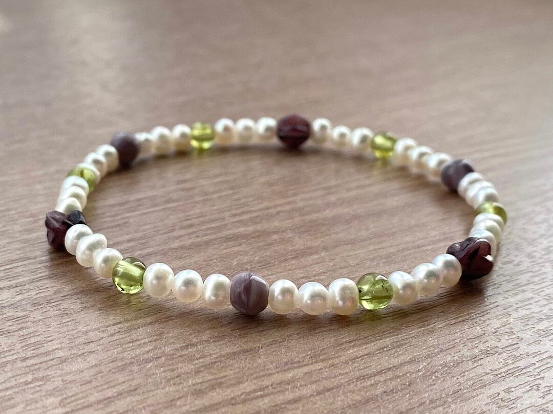 こちらのブレスレットは、4mmのペリドットとパープル系のヴィンテージビーズをバランスよく散りばめ、淡水パールを組み合わせることで、上品で洗練された印象に仕上げました。落ち着いた色合いが大人の雰囲気を感じさせ、シンプルながらも装いに彩りを添える、日常使いにぴったりのアイテムです。