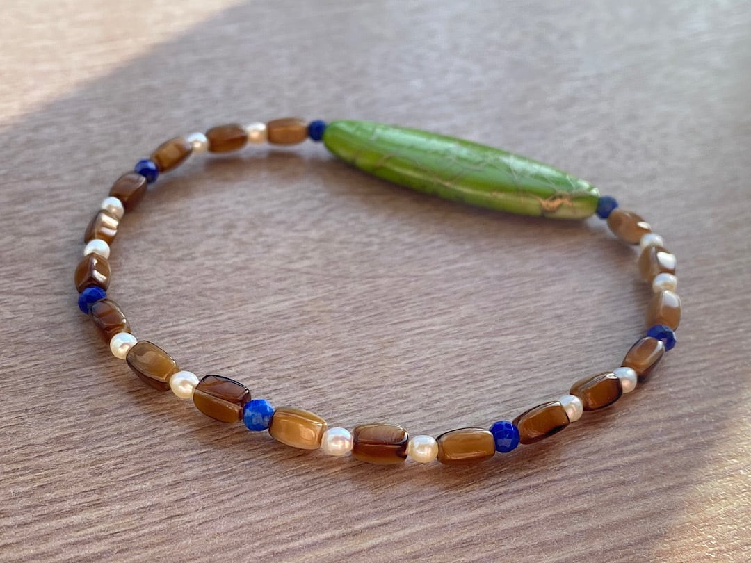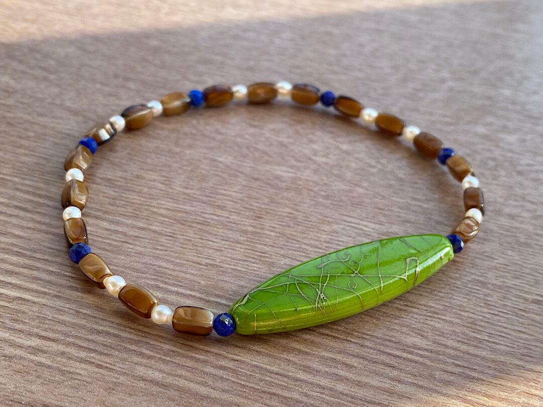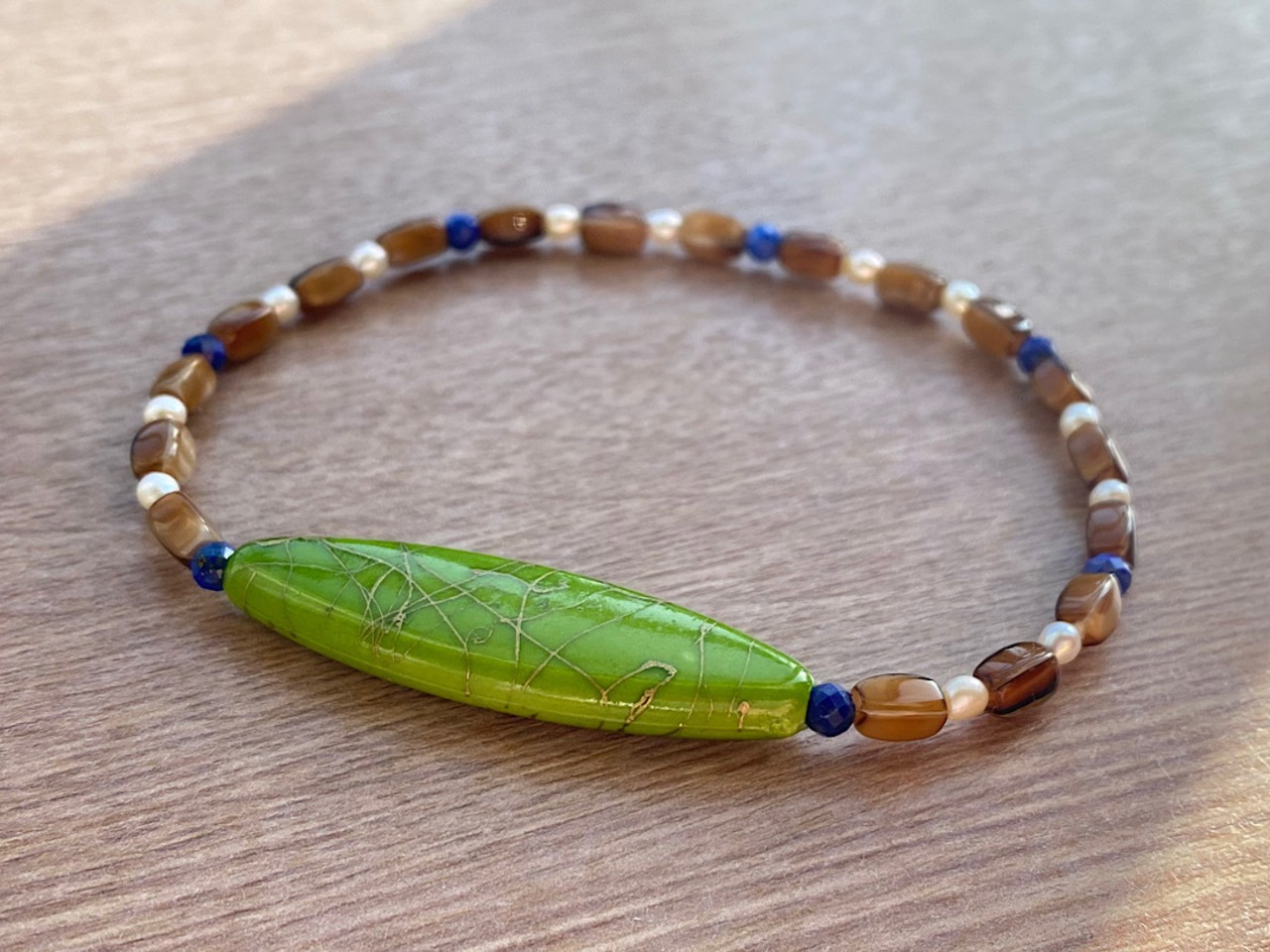 こちらは、アップルグリーンにゴールドのラインが施された、40mmのフラットオーバルビーズが印象的なブレスレットです。主役のビーズを囲むように、3mmの天然石ラピスラズリが深みのあるブルーで引き締め役となり、ブラウンのヴィンテージビーズと淡水パールが全体をやわらかく調和させています。鮮やかなオーバルビーズの彩りが、手元を華やかに引き立てます。