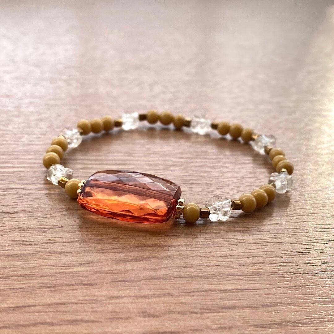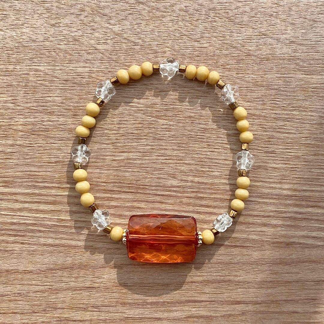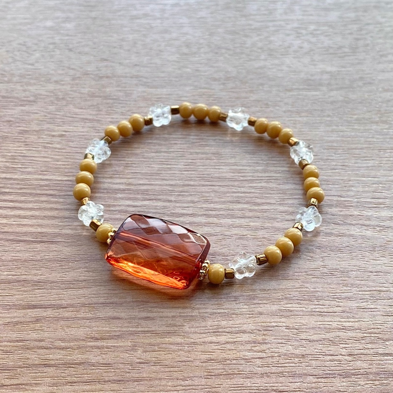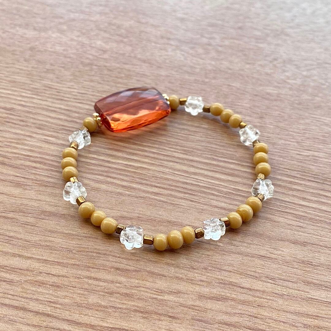 アンバービーズにベージュのヴィンテージビーズ、そして小さな花の形をしたクリアビーズを添えたブレスレット。