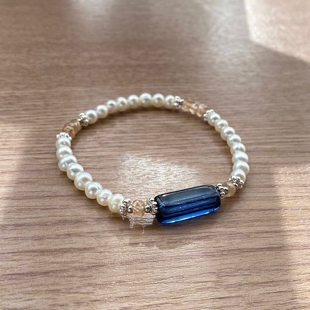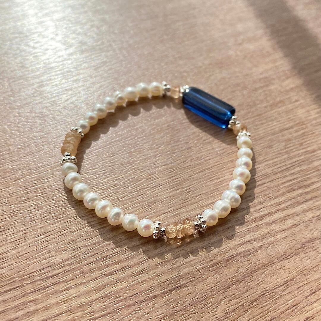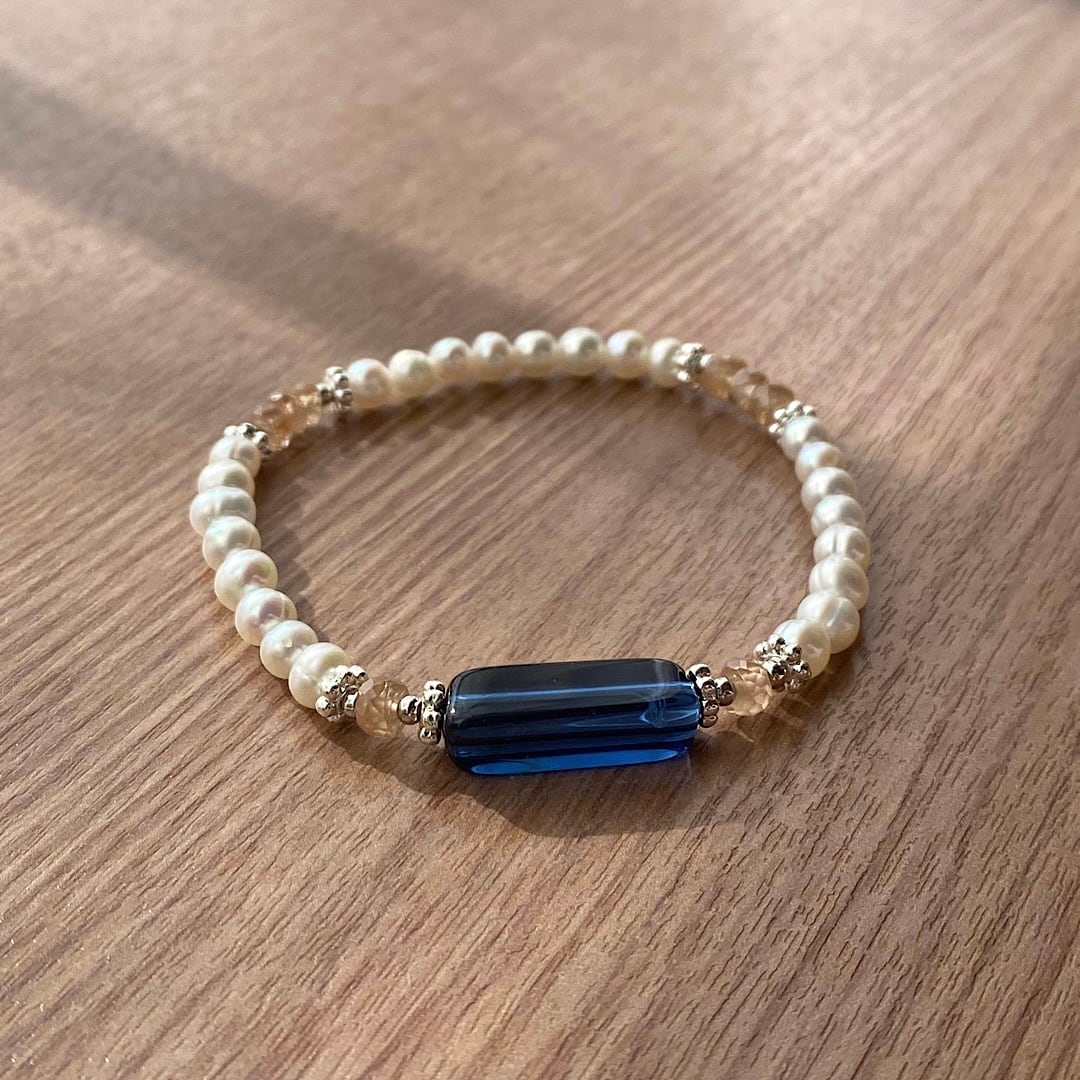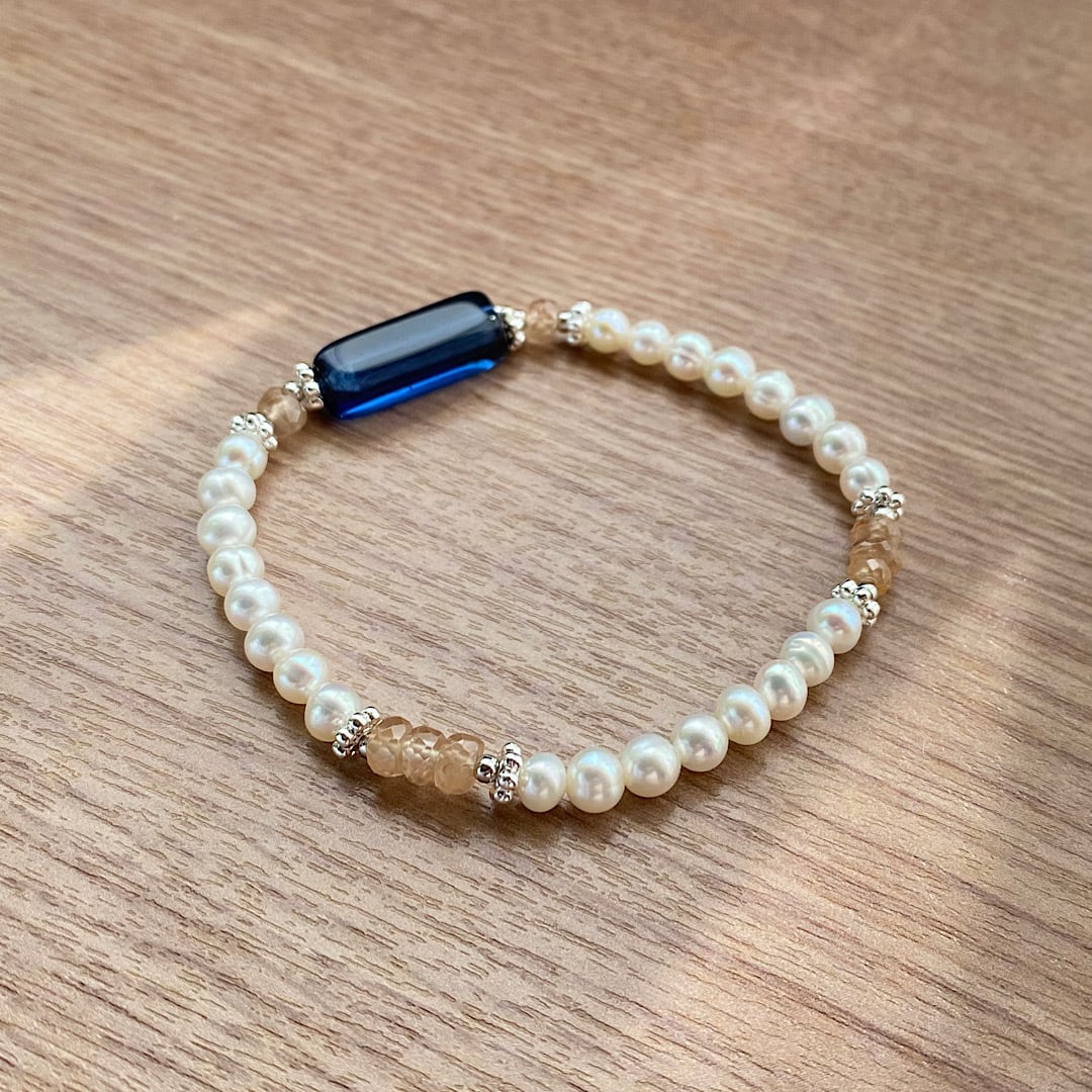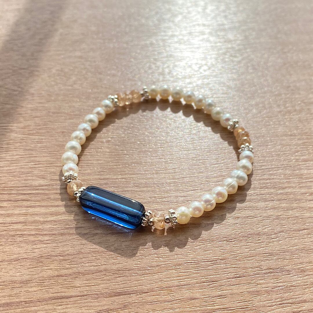 深い青色のヴィンテージビーズを中心に、やわらかな光沢の淡水パールを合わせたブレスレット。