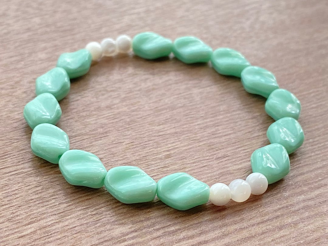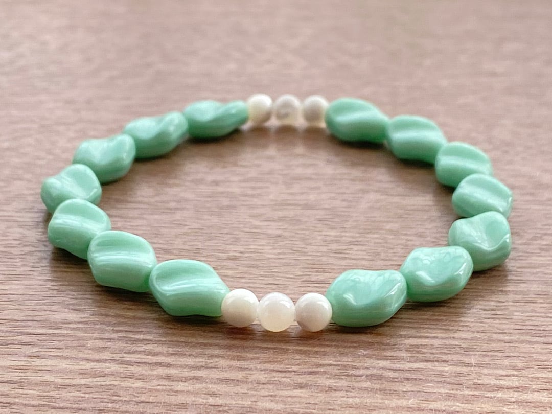 こちらは、波をイメージさせるミントグリーンのヴインテージビーズが特徴のブレスレットです。そこに4mmの天然石マザーオブパールを合わせることで、優しく洗練された印象に仕上げています。シンプルな装いに、爽やかなミントグリーンが手元を上品に見せ、日常使いにぴったりのアイテムです。
