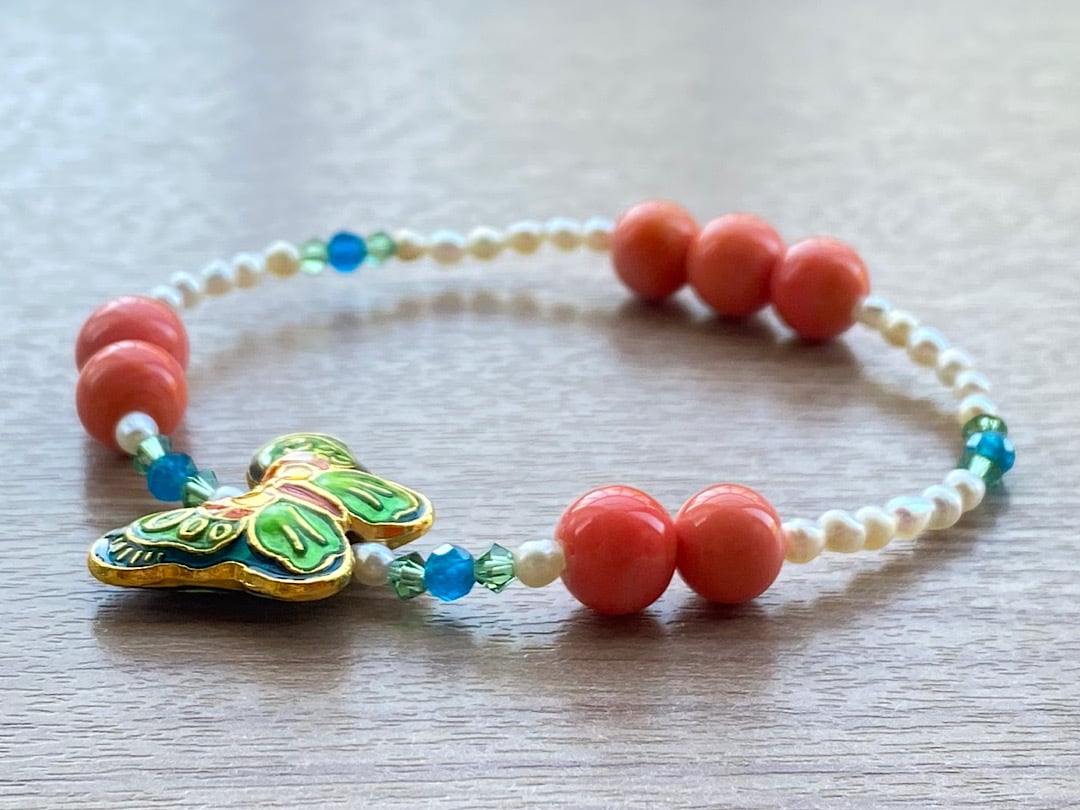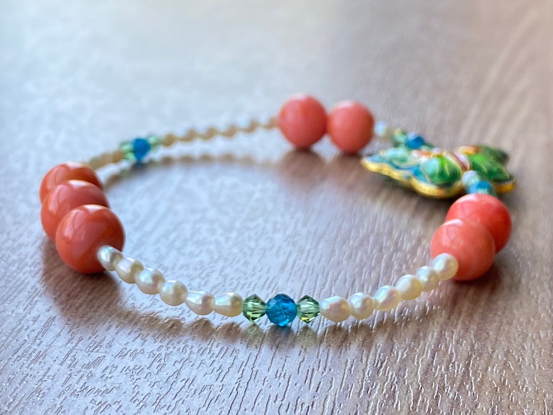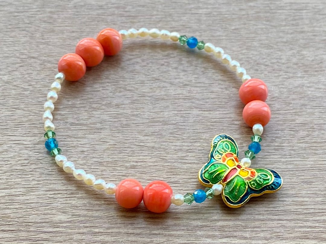こちらは、ブルー、グリーン、オレンジが美しい蝶のビーズを主役にしたブレスレットです。コーラルピンクのヴィンテージビーズを添えて明るく鮮やかなアクセントを加えました。さらに、3mmの天然石ネオンブルーアパタイトと淡水パールを組み合わせることで、品のある落ち着きもプラスしています。手元を明るく華やかに彩る、存在感のあるアイテムです。