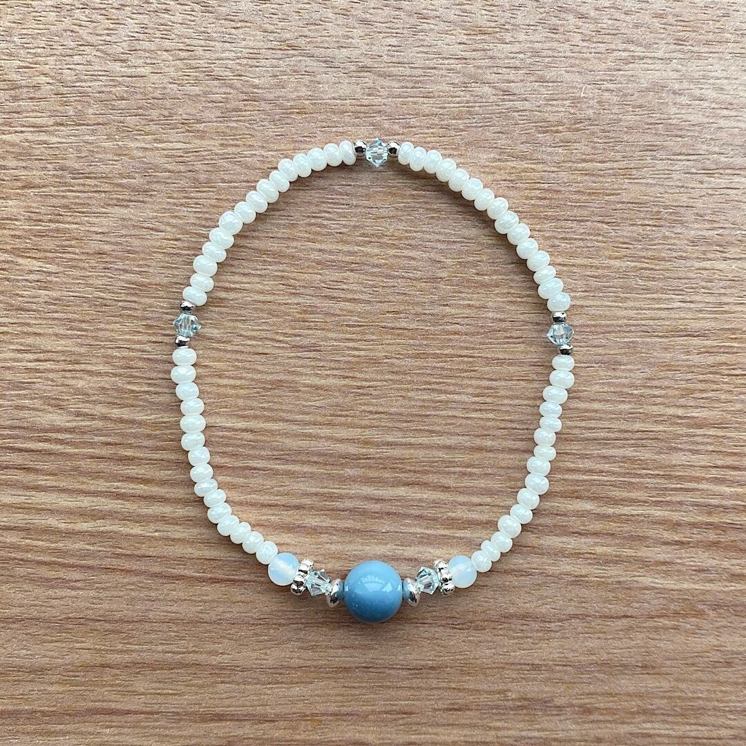 ブルーオパールを中心に、ホワイトのヴィンテージビーズを組み合わせたブレスレットです。