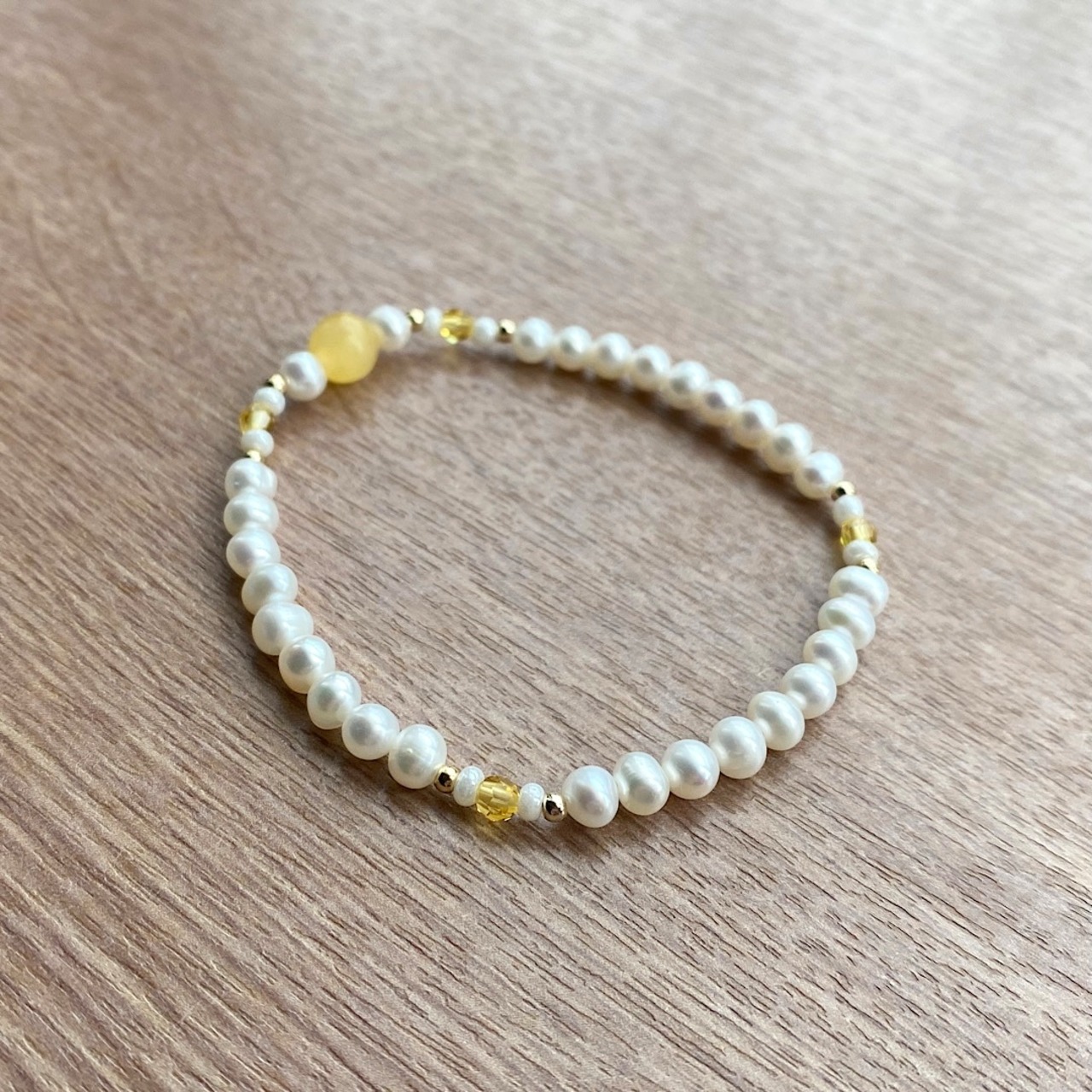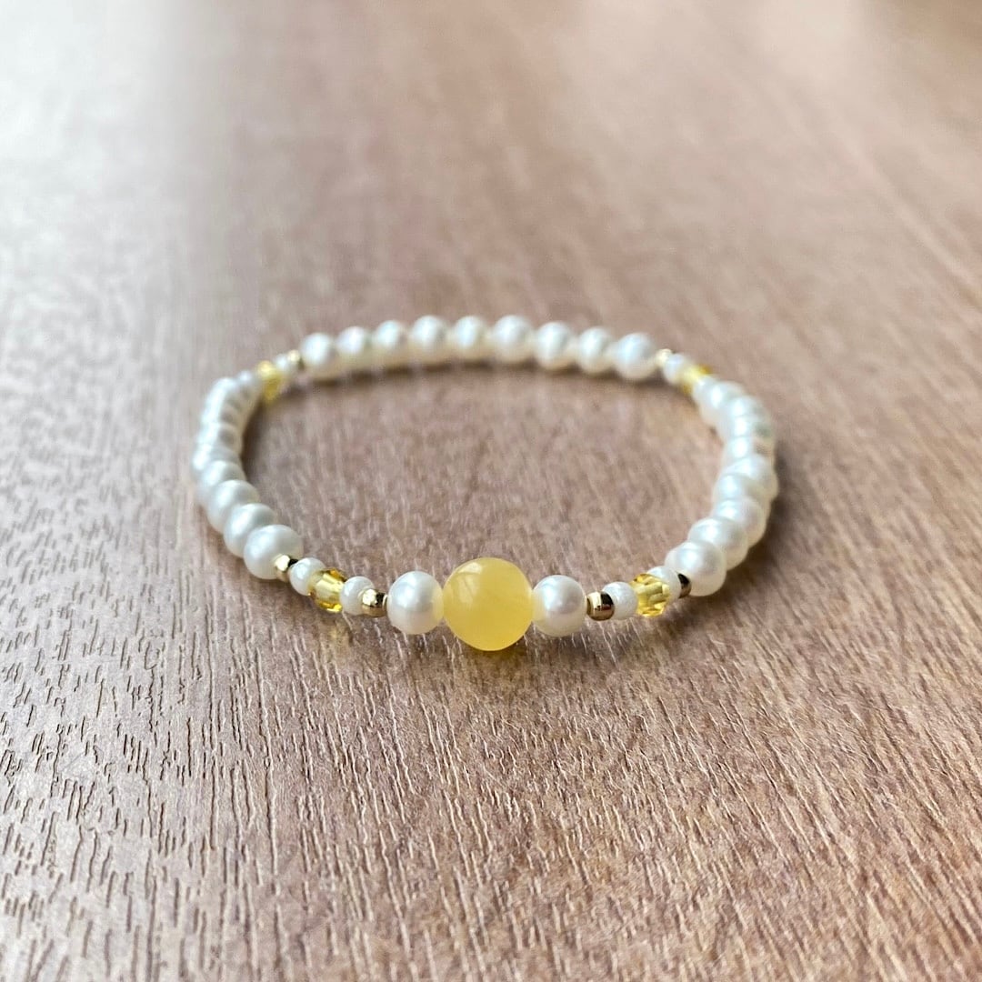 日常にも合わせやすい、やさしい色合いのブレスレットです。