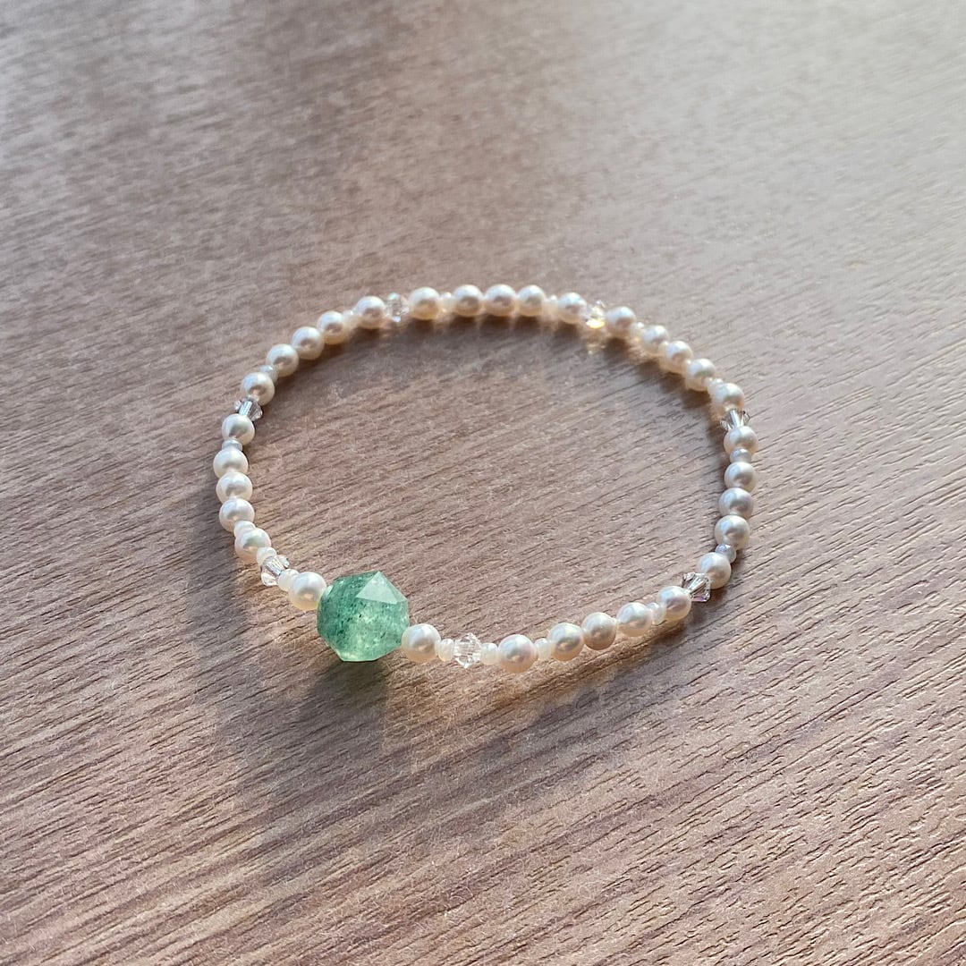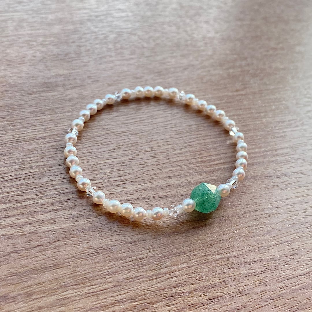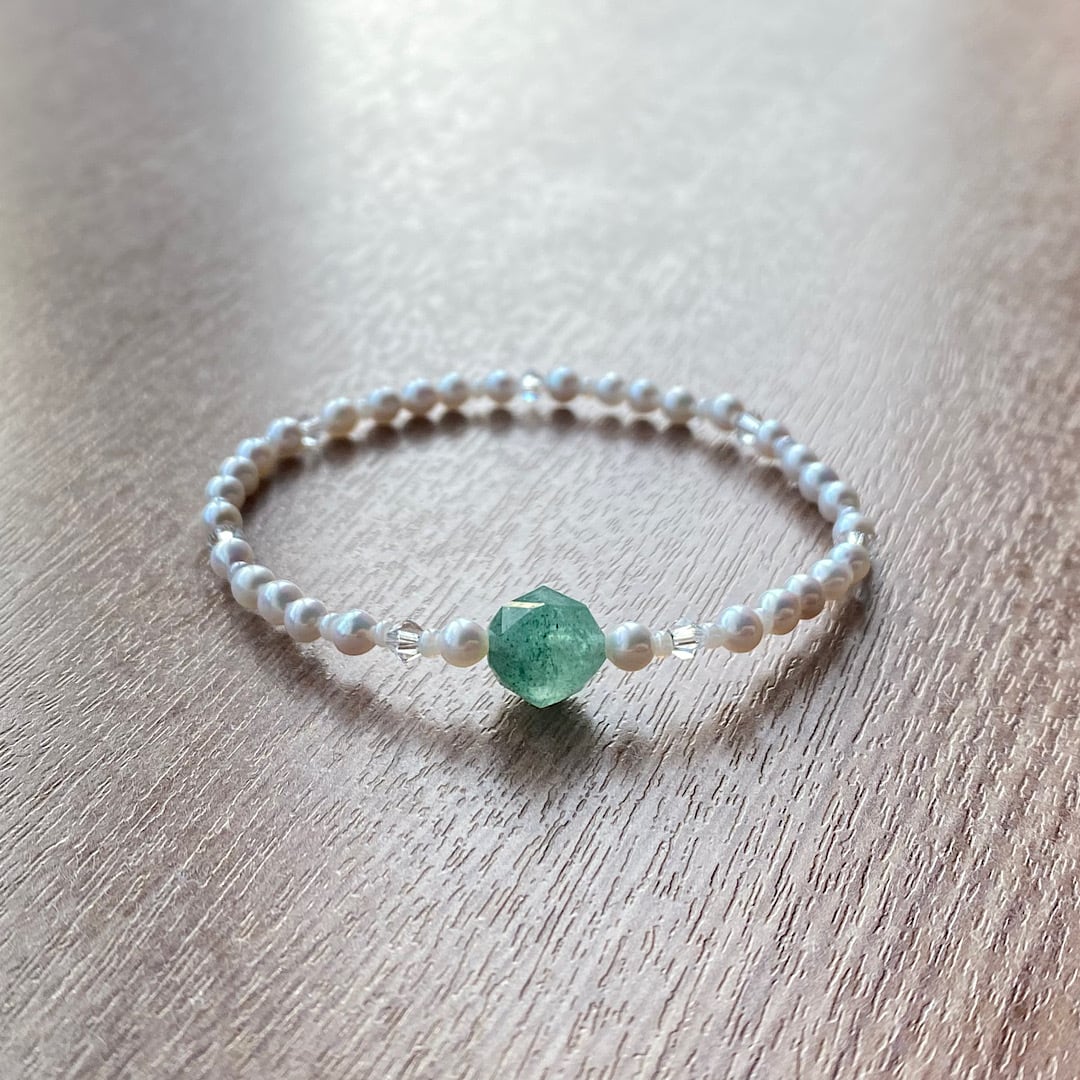 グリーンアベンチュリンを中心に、淡水パールとクリスタルビーズを組み合わせたブレスレット。